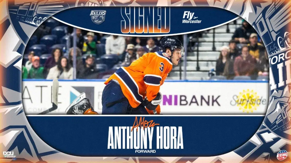 The Worcester Railers, along with head coach and general manager Nick Tuzzolino, announced Monday that the club has signed defenseman Anthony Hora to an ECHL contract for the 2025-26 season.