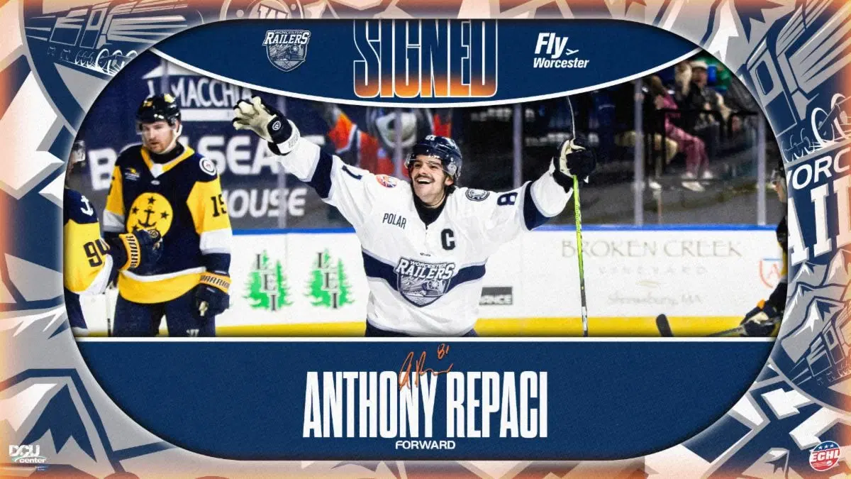 The Worcester Railers, along with Head Coach & General Manager Nick Tuzzolino, announced today that the club has re-signed captain Anthony Repaci to an ECHL contract for the 2025-26 season.