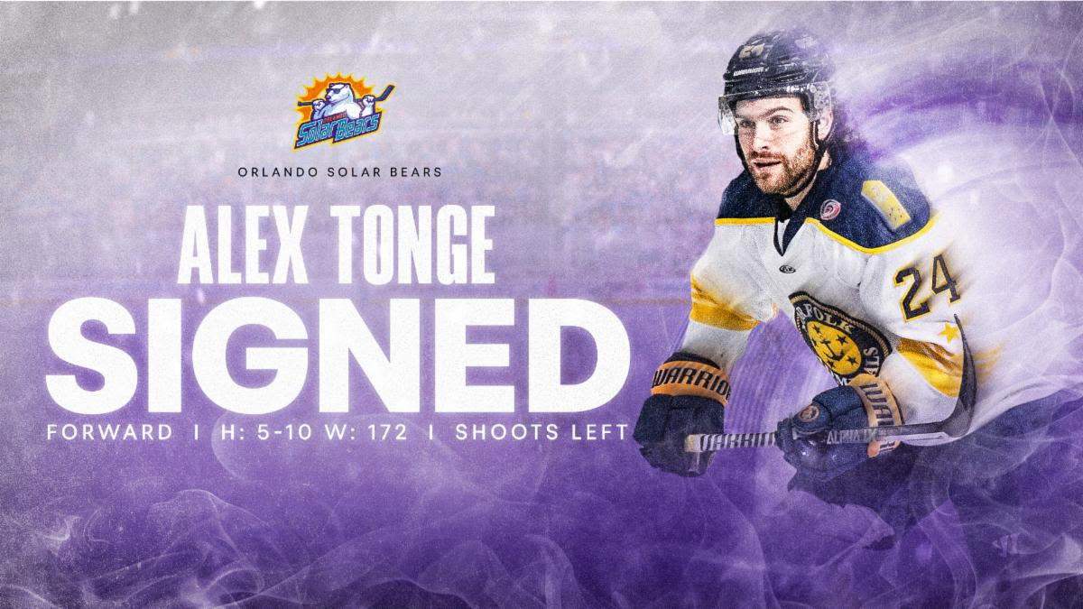 A former ECHL All-Star is back in the league once again, as the Orlando Solar Bears have announced the signing of forward Alex Tonge (TAHNJ) to a contract for the 2025-26 season.