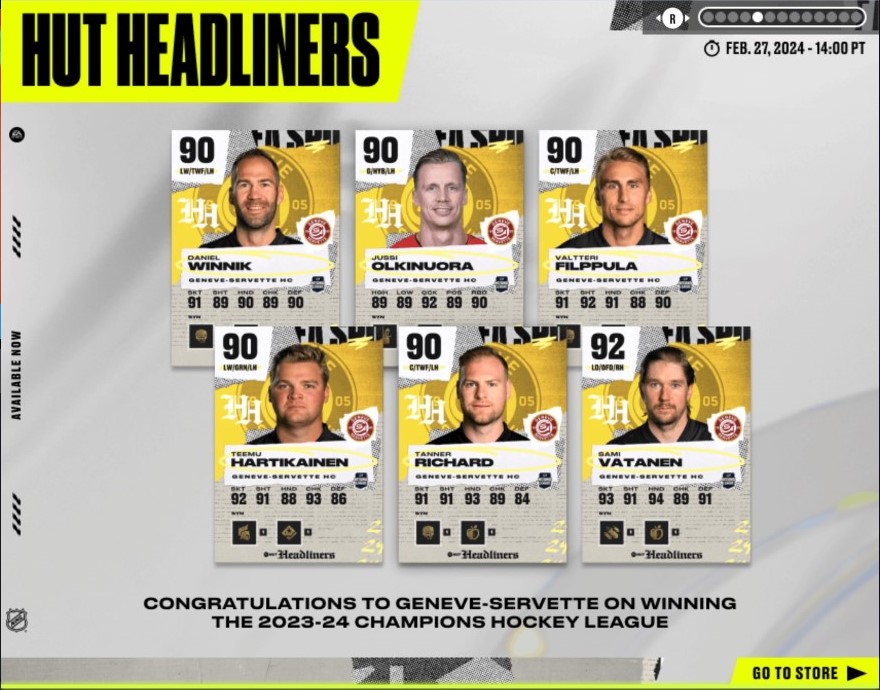 After defeating Skelleftea AIK on Tuesday to capture the 2024 Champions League title six Geneve-Servette players received Headliners cards in NHL 24 Hockey Ultimate Team.