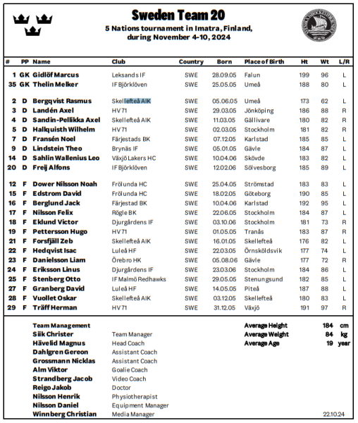 “This is our last tournament before we have to send a squad to the World Junior Championship in Ottawa,” said head coach Magnus Hävelid. “It is pleasing to see in Swedish hockey that there are always new young players coming up in our highest leagues, which increases the competition for places at the upcoming World Juniors.”