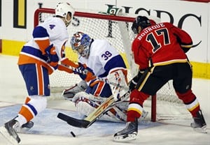 Calgary native Nathan Lawson, who was recalled from Bridgeport of the American Hockey League after the Islanders traded Dwayne Roloson to Tampa Bay on Saturday, replaced DiPietro in goal for New York and finished with 28 saves.