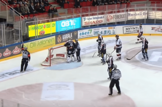 In Wednesday’s Liiga game between Lassila’s TPS Turku and Porin Assat, Lassila was out to play the puck behind his net with former NHLer Josh Gratton skating towards him. Lassila beat Gratton to the puck and was able to move it up the boards, but after getting a slight bump from Gratton, Lassila swung his stick violently and caught Gratton in the face with the back edge of the paddle: