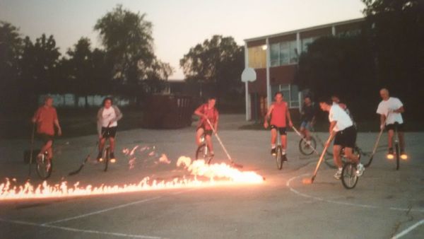 “I came up with, ‘Wow, what if we dipped this in fluid? And instead of, like, juggling fire, we play hockey with it?’ And I’ll tell you, it became worldwide.” Bedford’s club is more about the members enjoying the game than building toward a goal of playing in the world championship – the group’s motto is “having fun on one wheel,” after all.