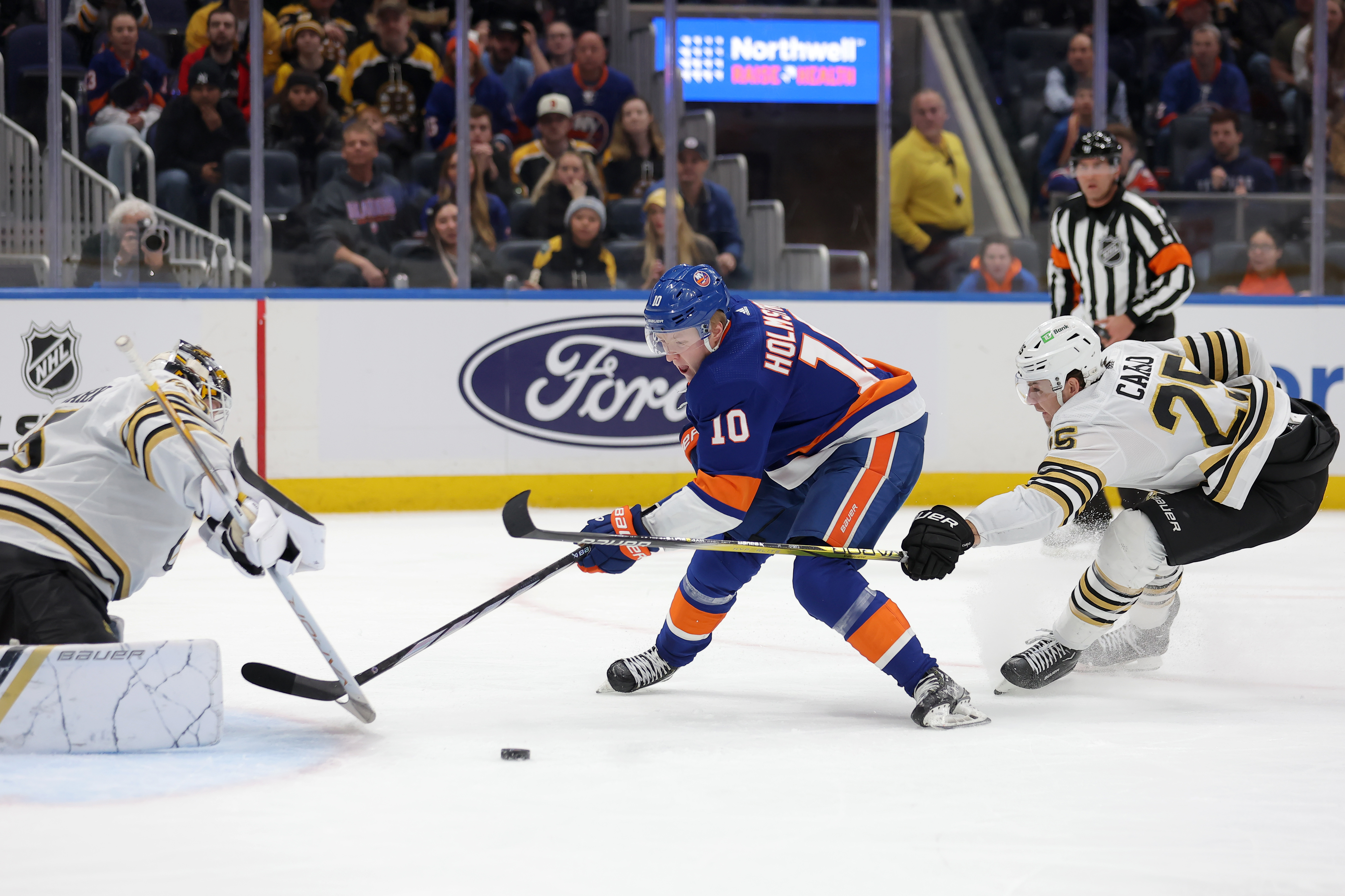 Brock Nelson made it 5-0 at 10:24 of the second after Bo Horvat forced a Brandon Carlo turnover and fed Nelson in front from the left corner boards.