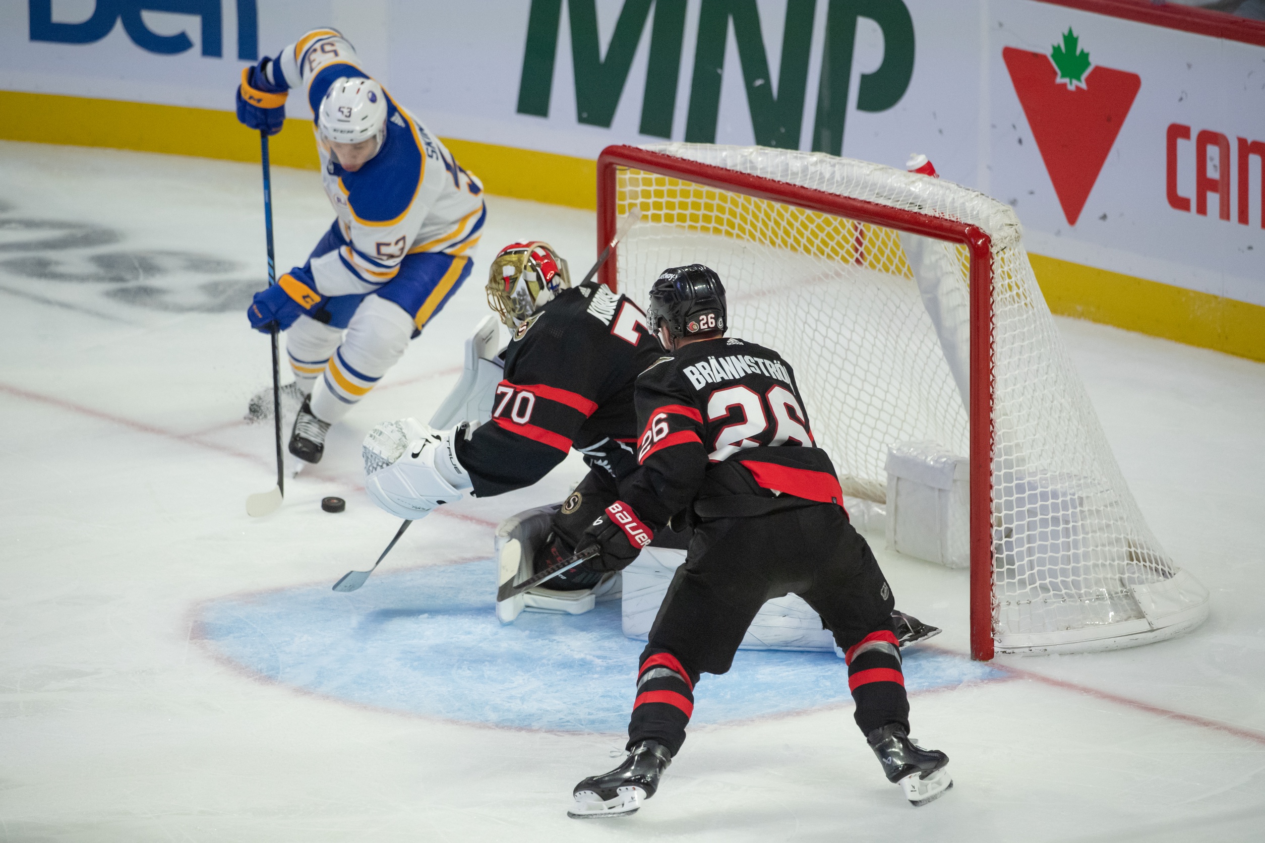 Heeding the advice of head coach Don Granato, the Sabres were much more active in front of Forsberg, who was 2-0, with a 1.50 GAA entering the game. Goals by Zemgus Girgensons, Thompson, and Tuch were all on deflections of point shots where the Ottawa goalie's vision was obscured.