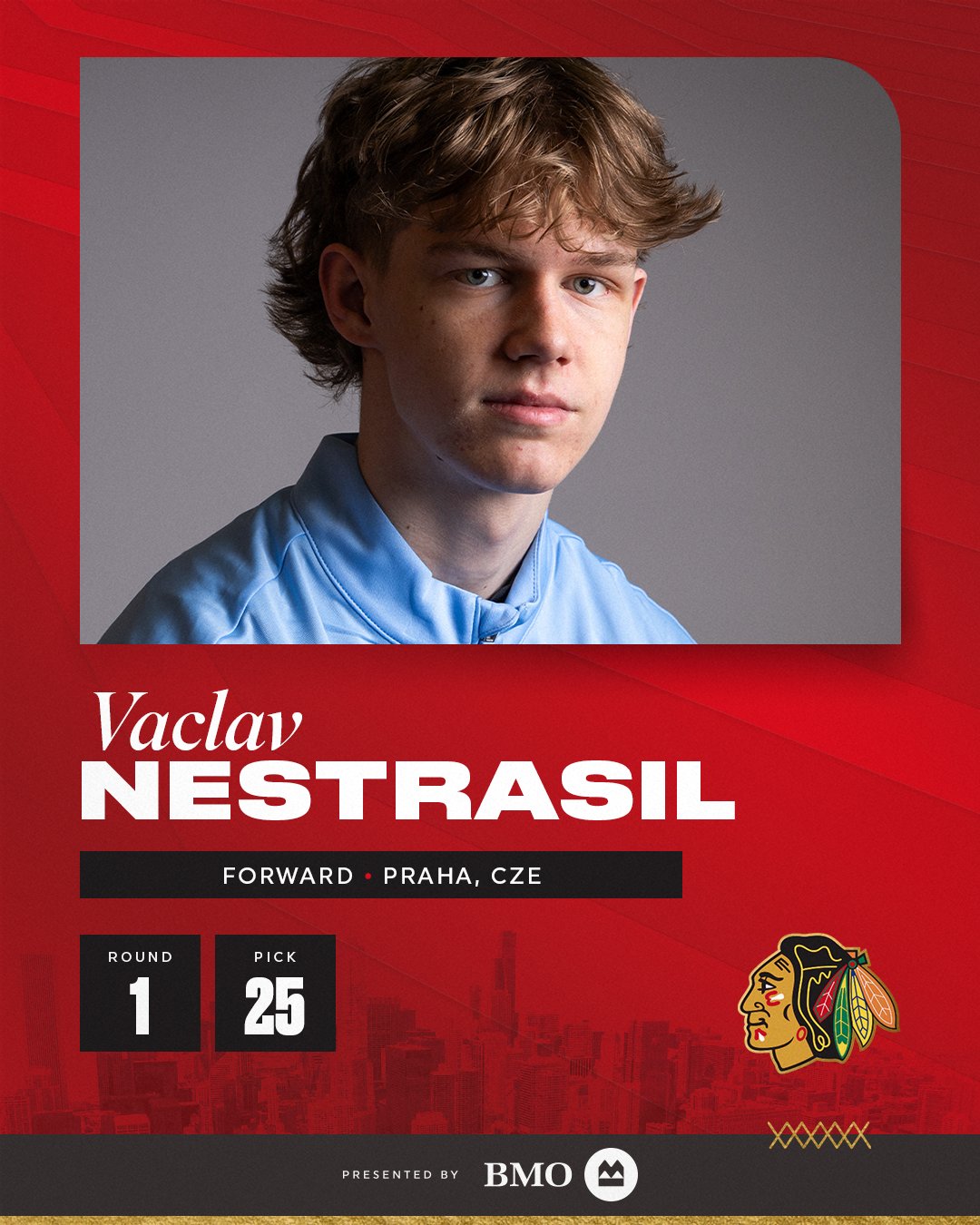 With the 25th overall pick, the Blackhawks selected Vaclav Nestrasil. He became the first player selected from the USHL, as he comes from the Muskegon Lumberjacks.