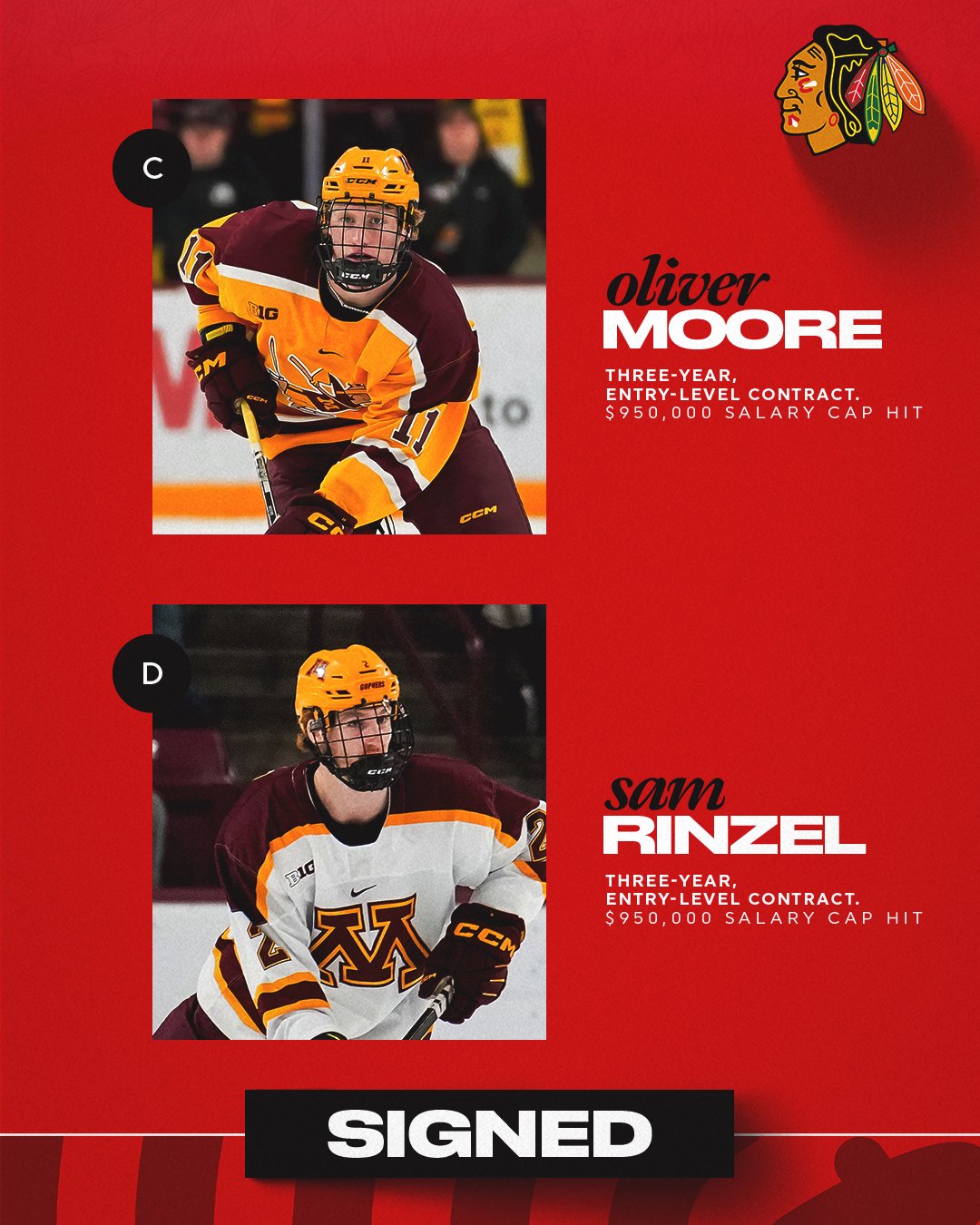 Each signed a three-year entry-level contract with a cap hit of $950,000 and will begin their pro-hockey careers. Both Moore and Rinzel will join the Blackhawks immediately.