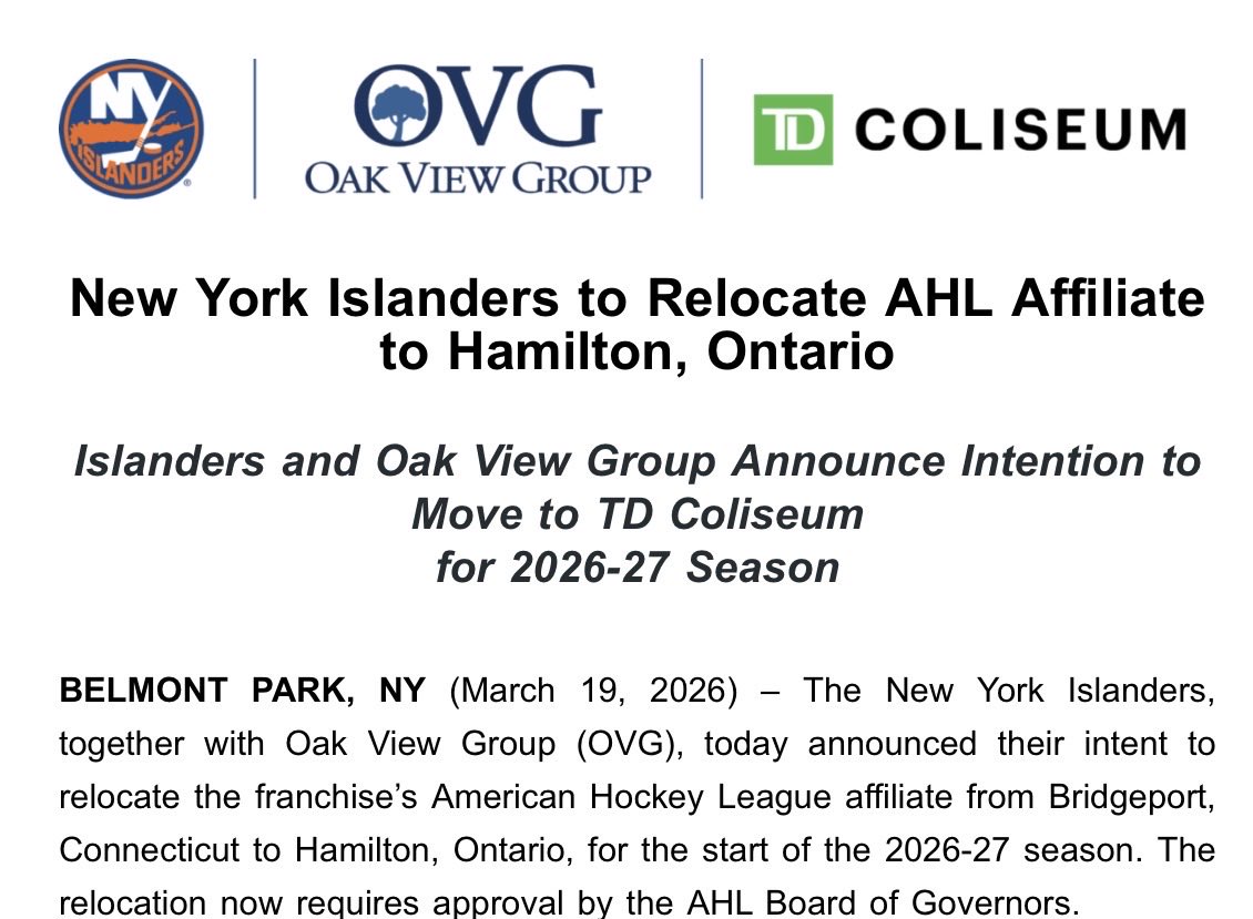 Islanders Move AHL Team From Bridgeport To Hamilton Next Season