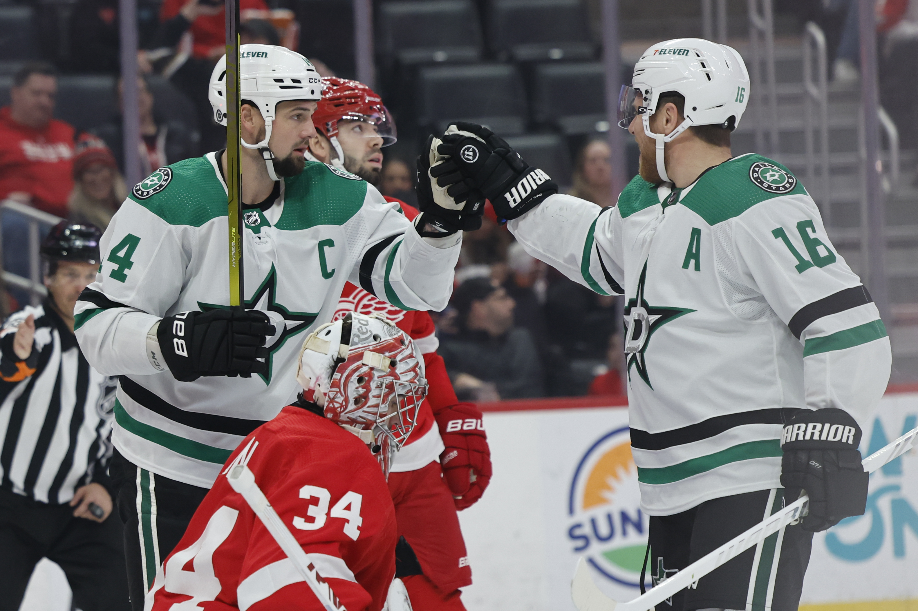 The first period started with an early power-play goal from Jamie Benn who snapped an eight-game goalless drought. But Detroit was able to answer with two of their own power-play goals from David Perron and Alex DeBrincat.