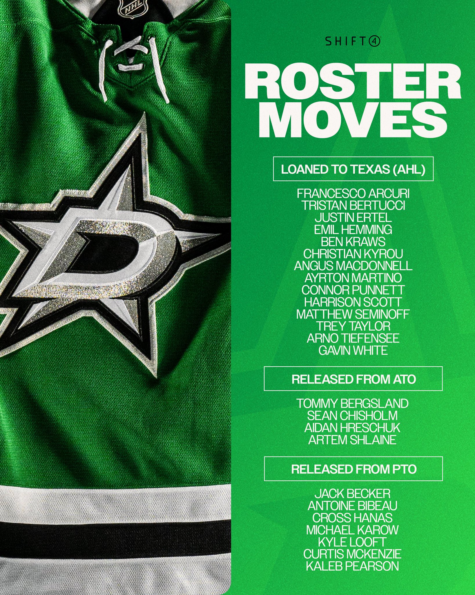 Of the 25 players, 14 players received demotions to the AHL's Texas Stars including the likes of 2024 first round pick Emil Hemming and second round pick Tristan Bertucci, seven players including the likes of ex-Stars forward Curtis MacKenzie and goaltender Antoine Bibeau were released from pro-try outs and four players were released from amateur try-outs.