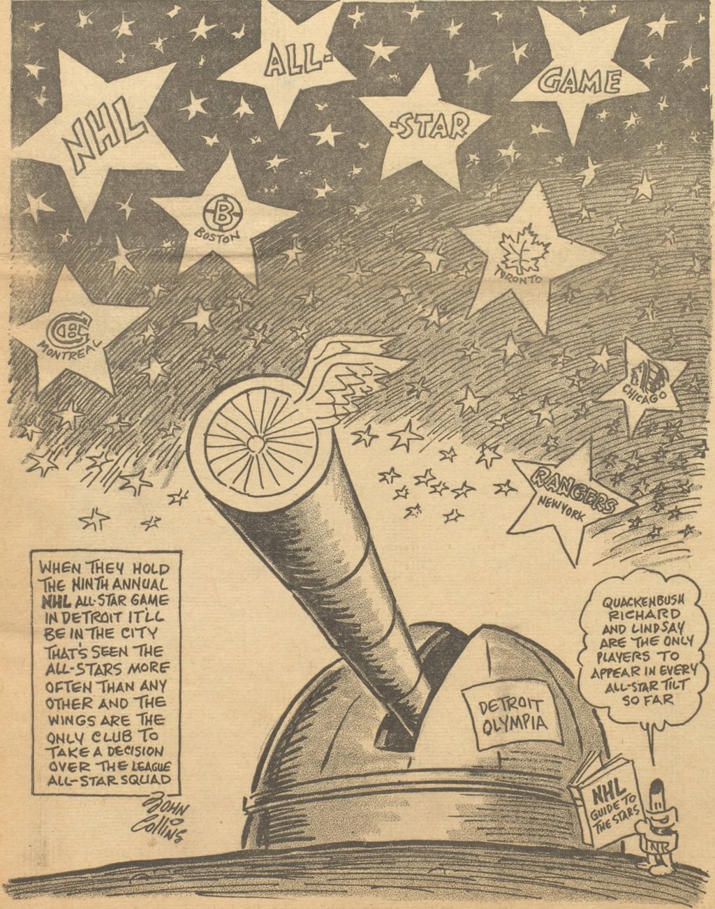 For the fourth time in nine years, the National Hockey League’s annual All-Star Game is being played in Detroit, and the Red Wings are pointing for their second victory, an enviable record when it is recalled that no other team has ever defeated the All-Star crew, made up of the league’s top players.