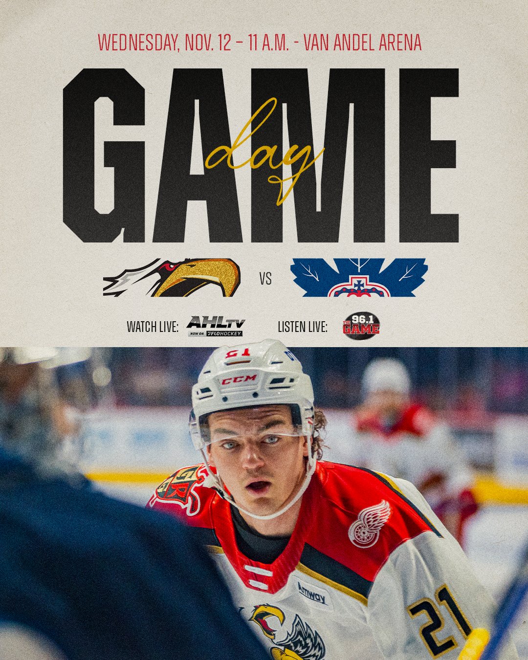 Wednesday’s matchup promises high intensity and plenty of offense as the Griffins aim to make a statement against an NHL-caliber goaltender. Puck drop is set for 11 a.m. EST. Fans can listen live on WOOD 106.9 FM and 1300 AM or stream the action on AHLTV via FloHockey.
