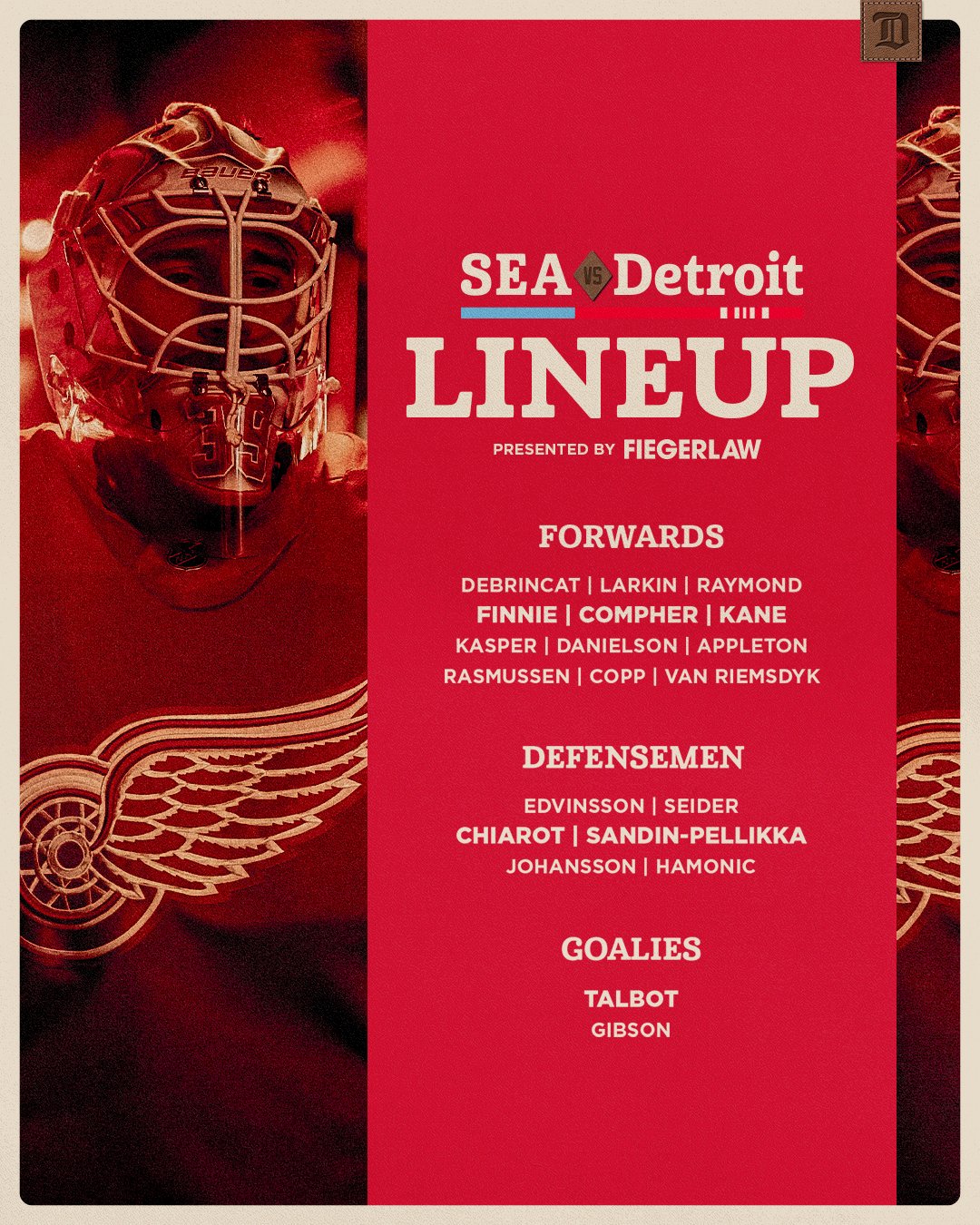 Detroit is making several lineup adjustments. Rookie Emmitt Finnie moves to the second line after a ten-game scoring drought, while DeBrincat jumps to the top unit alongside Dylan Larkin and Lucas Raymond. Michael Rasmussen shifts to the fourth line despite a two-point night in Anaheim, and Cam Talbot is projected to start in goal. Special-teams changes continue as Nate Danielson centers the second power-play unit, while the top group loads up with Larkin, DeBrincat, and Patrick Kane supported by Raymond and Axel Sandin-Pellikka.