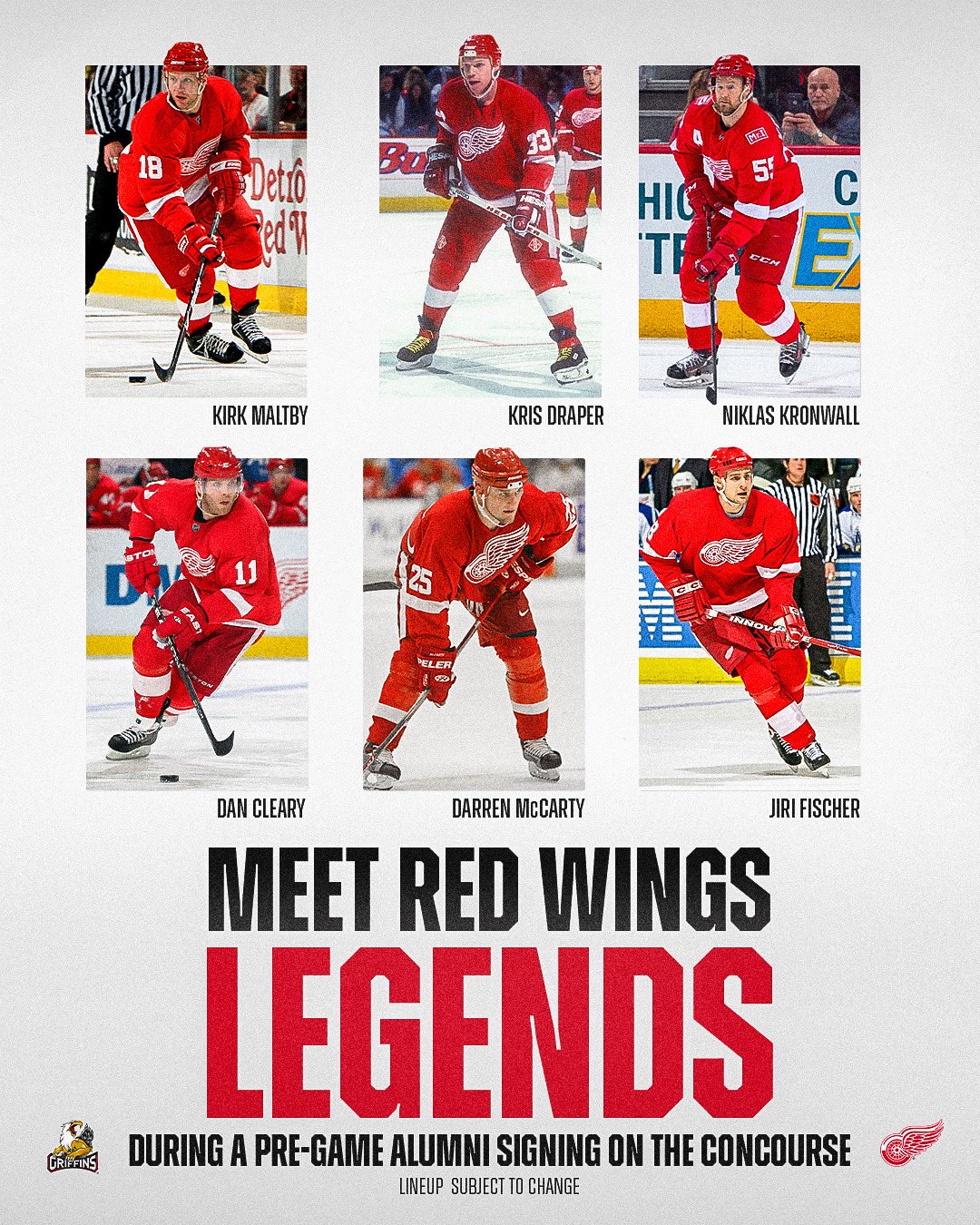Before the puck drops, attendees can enjoy a meet-and-greet with former Red Wings greats including Dan Cleary, Kris Draper, Jiri Fischer, Niklas Kronwall, Kirk Maltby, and Darren McCarty (subject to availability).