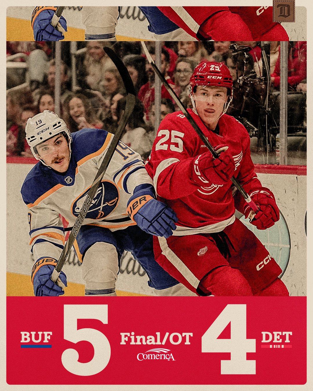 The Red Wings were stunned by the Buffalo Sabres, who mounted a four-goal comeback effort as part of their 5-4 overtime win at Little Caesars Arena on Saturday evening.