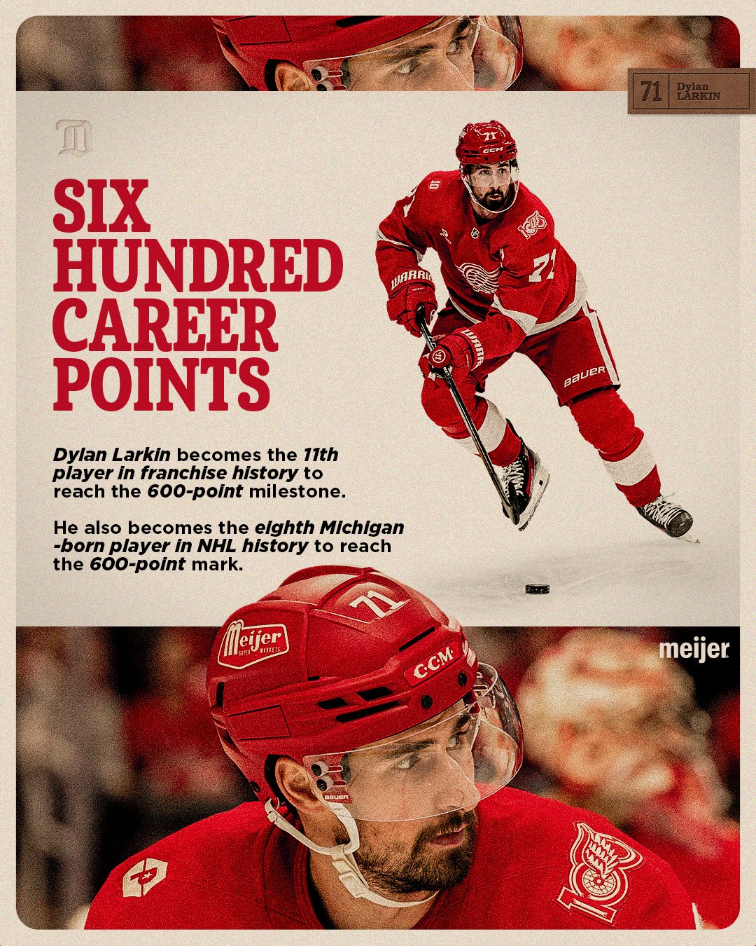 In a landmark moment for one of the best Detroit Red Wings in recent history, Dylan Larkin recorded his 600th NHL point in Tuesday's 4–2 victory over the Seattle Kraken.