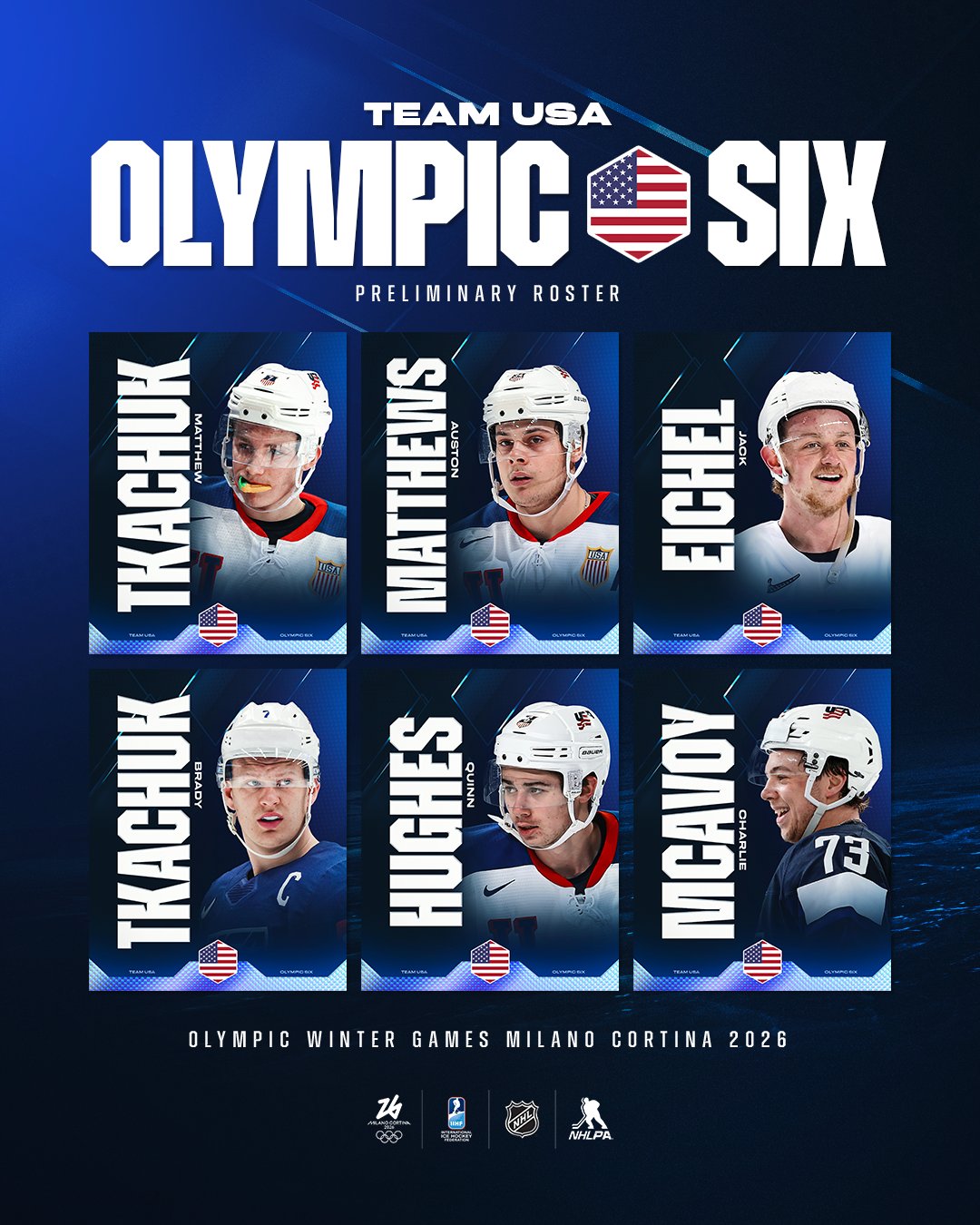 USA Hockey has officially revealed the first six names tapped to lead its men’s national team into the 2026 Winter Olympics in Milan–Cortina, and it’s a group stacked with high-end NHL talent: brothers Matthew and Brady Tkachuk, Auston Matthews, Quinn Hughes, Charlie McAvoy, and Jack Eichel.