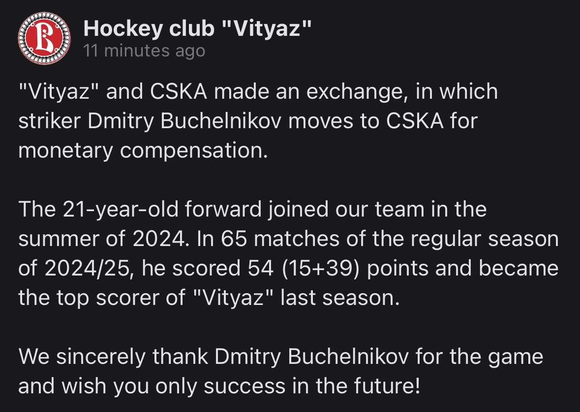 The move to CSKA marks Buchelnikov’s third KHL team in just two seasons, but it also represents his clearest chance yet to compete at a high level in a playoff-caliber environment.