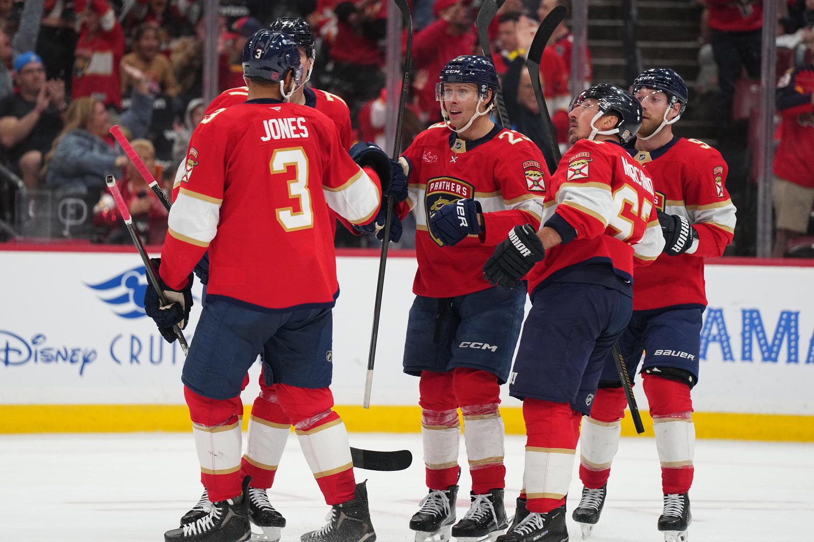 Photo caption: Dec 6, 2025; Sunrise, Florida, USA; Florida Panthers center Carter Verhaeghe (23) celebrates a goal against the Columbus Blue Jackets with teammates during the second period at Amerant Bank Arena. (Jim Rassol-Imagn Images)