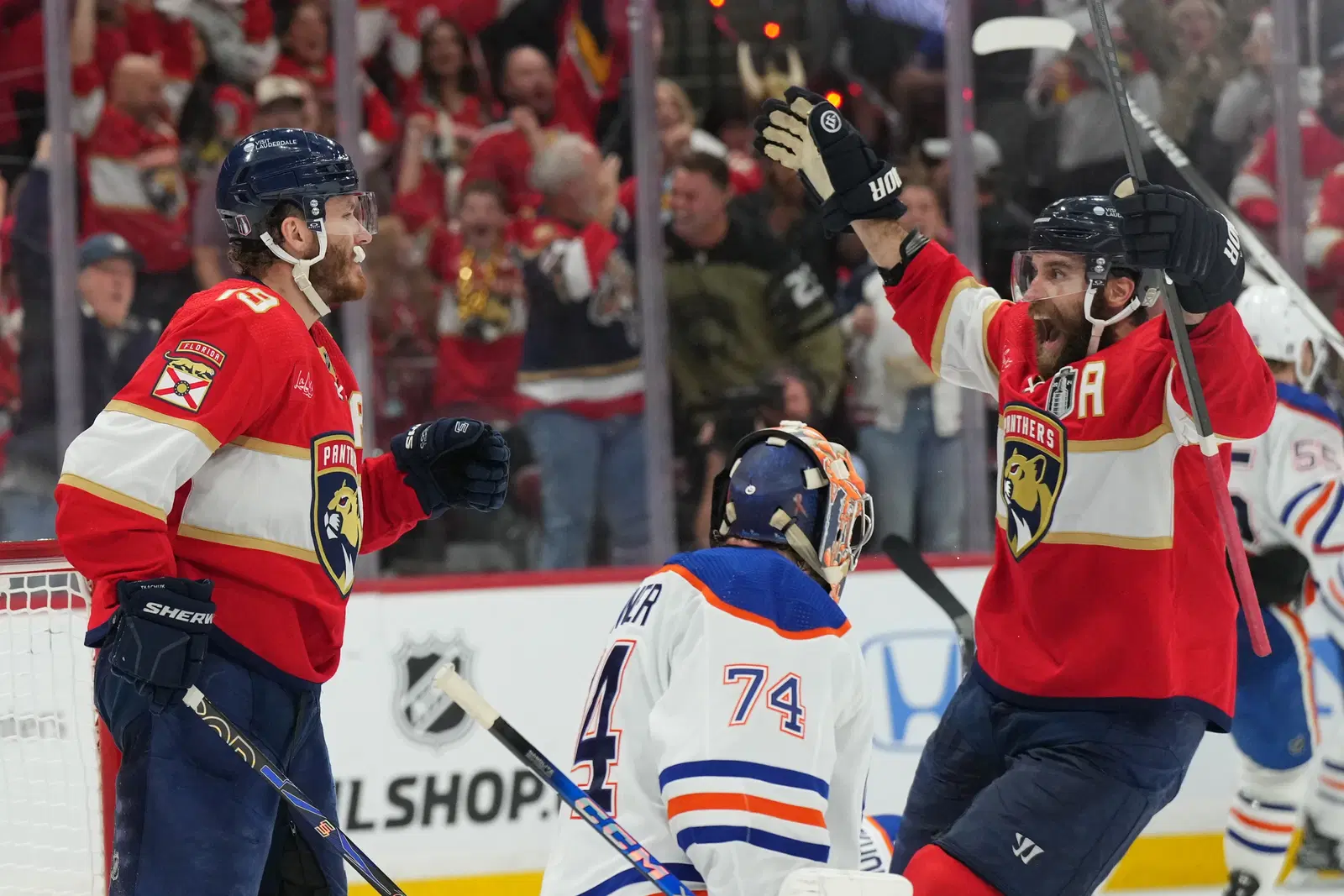 Photo caption: Jun 18, 2024; Sunrise, Florida, USA; Florida Panthers forward Matthew Tkachuk (19) celebrates scoring against Edmonton Oilers goaltender Skinner Stuart (74) with Florida Panthers defenseman Aaron Ekblad (5) during the second period in game five of the 2024 Stanley Cup Final at Amerant Bank Arena. (Jim Rassol-Imagn Images)