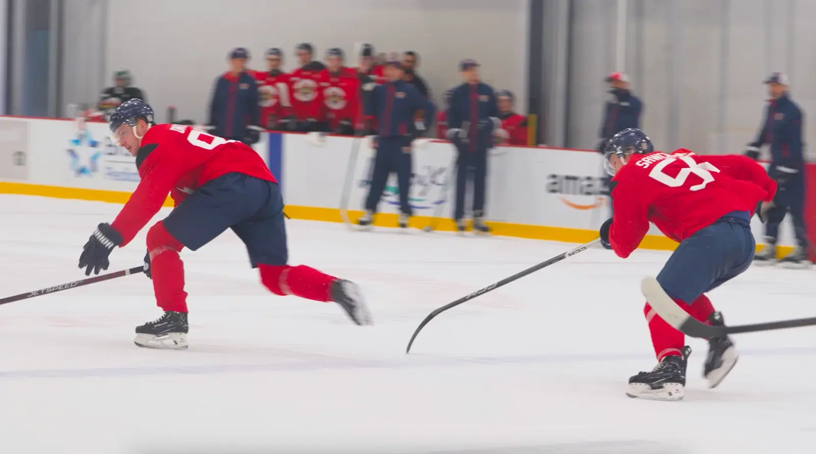 Photo caption: Florida Panthers youngsters Gracyn Sawchyn and Oliver Okuliar skate during a rookie showcase practice at the Baptist Health IcePlex in Fort Lauderdale. (Florida Panthers)