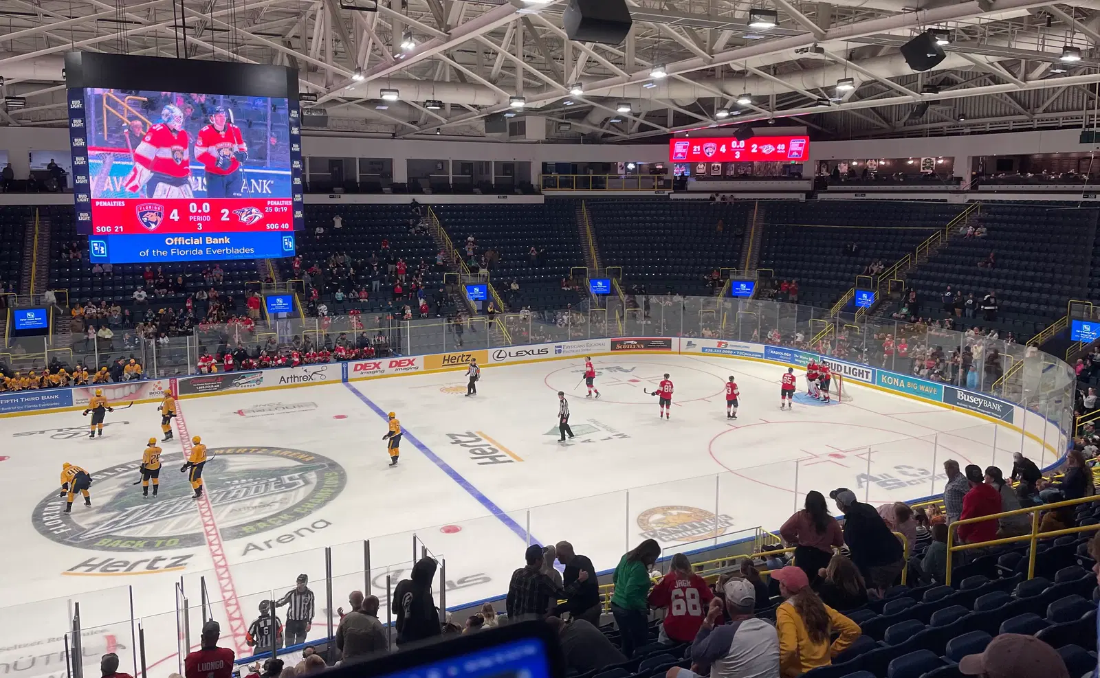 Photo caption: Florida Panthers prospects skate against the Tampa Bay Lightning during a 2023 NHL Prospect Tournament game at Hertz Arena in Estero, Florida. (David Dwork)