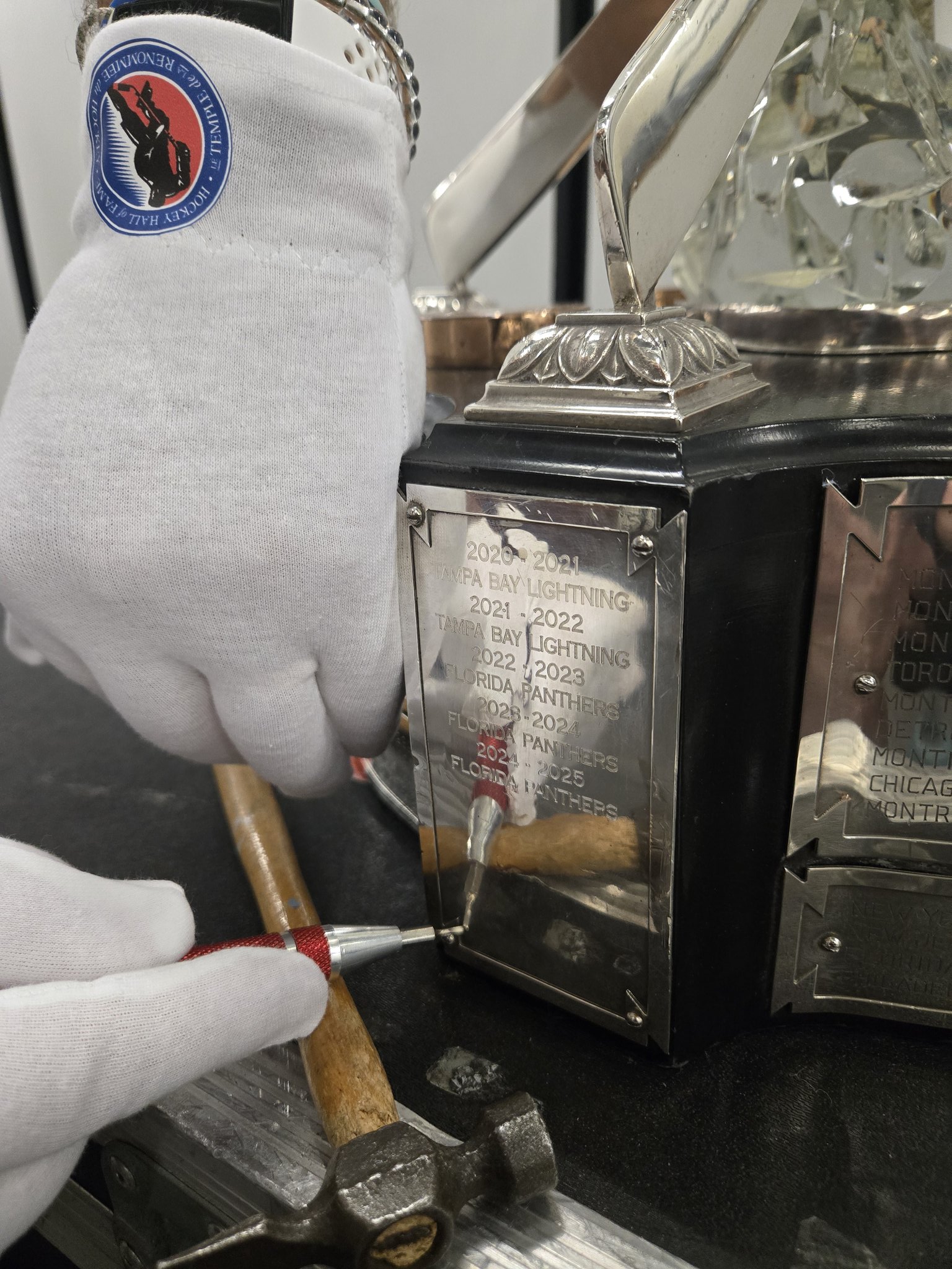 Photo caption: Photo of the Florida Panthers name being engraved onto the Prince of Wales Trophy posted on social media by Phil Pritchard, the Keeper of the Cup. (Source: @keeperofthecup on X)