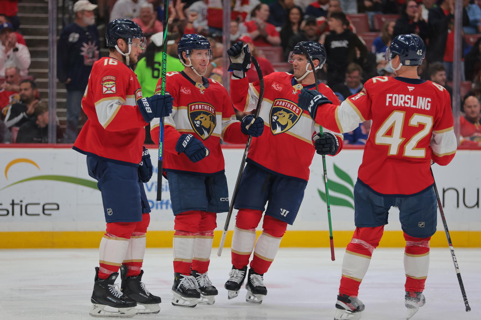 Photo caption: Apr 14, 2025; Sunrise, Florida, USA; Florida Panthers center Carter Verhaeghe (23) celebrates with center Aleksander Barkov (16) and defenseman Dmitry Kulikov (7) after scoring against the New York Rangers during the second period at Amerant Bank Arena. (Sam Navarro-Imagn Images)
