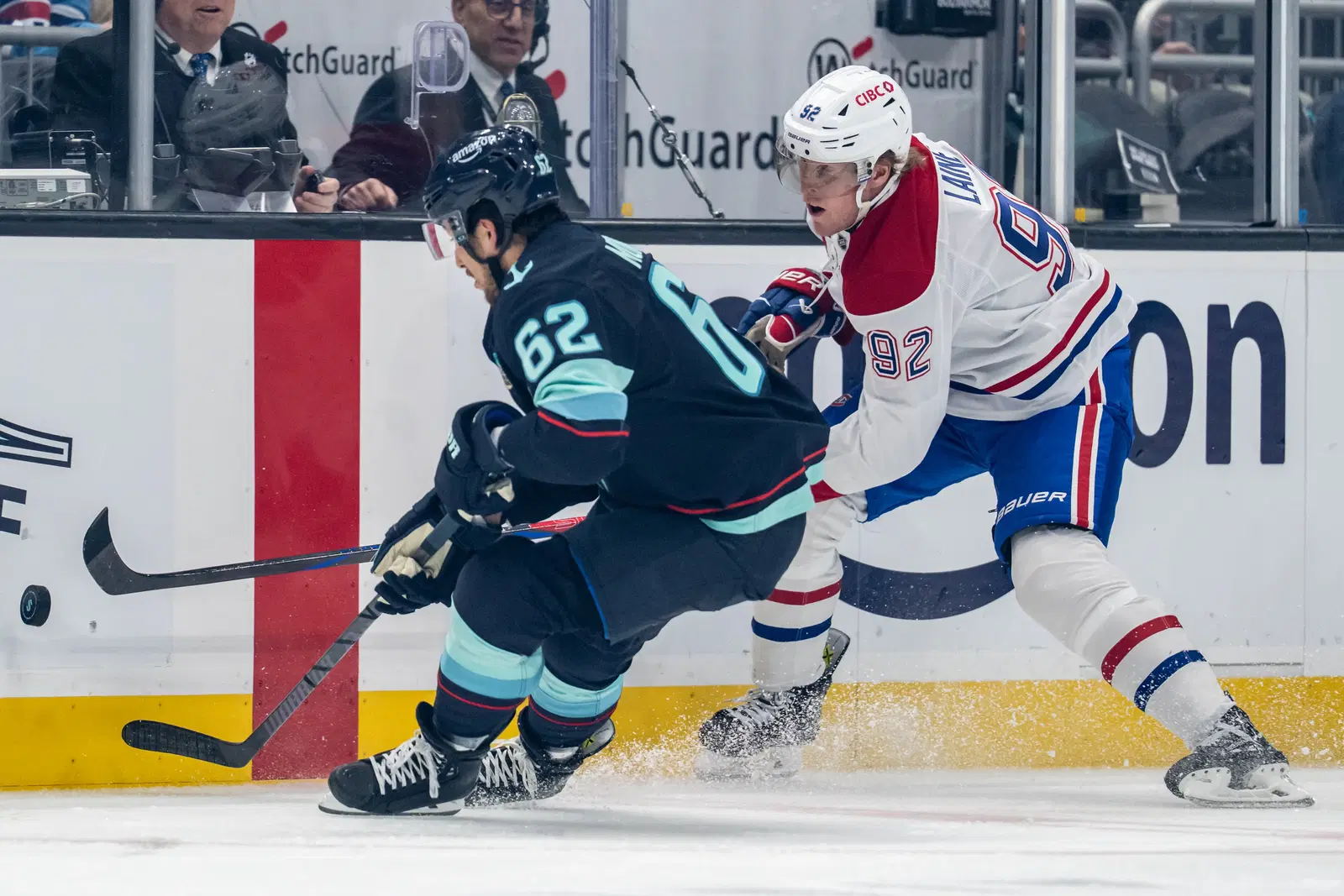 The Montreal Canadiens got some reinforcements to take on the Seattle Kraken on Wednesday night, as Patrik Laine was back in the lineup. Unfortunately, Joel Armia had to pull out because of an injury sustained in Tuesday’s game. As a result, Martin St-Louis had to shuffle his cards a bit. Laine took Michael Pezzetta’s spot with Christian Dvorak and Josh Anderson, while Pezzetta joined Jake Evans and Emil Heineman.