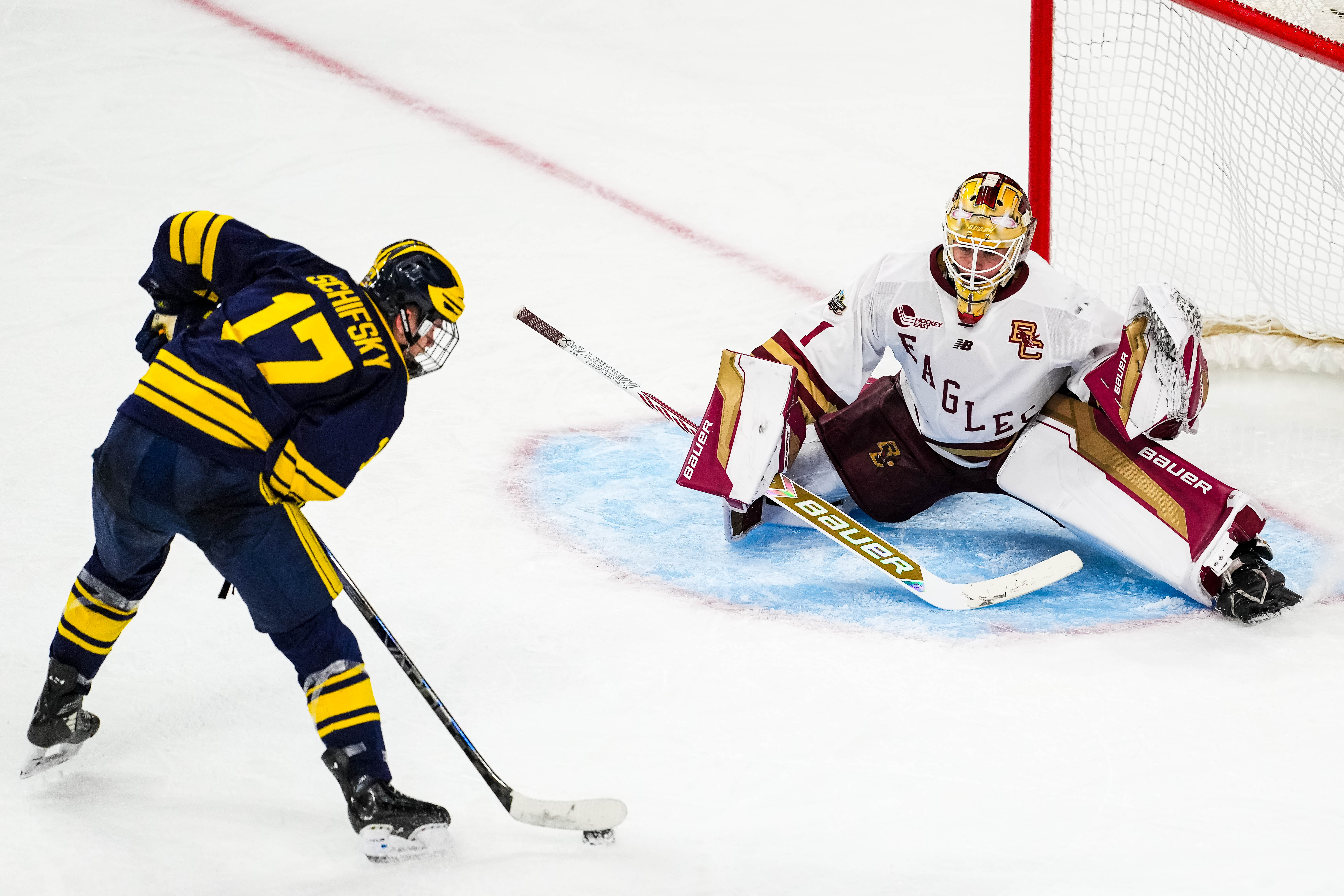 In a game against the UConn Huskies last night, Tristan Fraser crashed the net to score Uconn's third goal and slid into Fowler, which the goaltender did not like. As the Huskies were celebrating the goal and Fraser and Fowler were on the ice, the goalie sent a blocker punch to goal scorer's face.