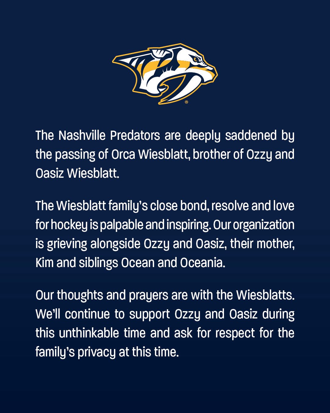We at The Hockey News join the Wiesblatt family and the hockey community in mourning the loss of Orca. Below is a statement from the Nashville Predators on the tragedy.