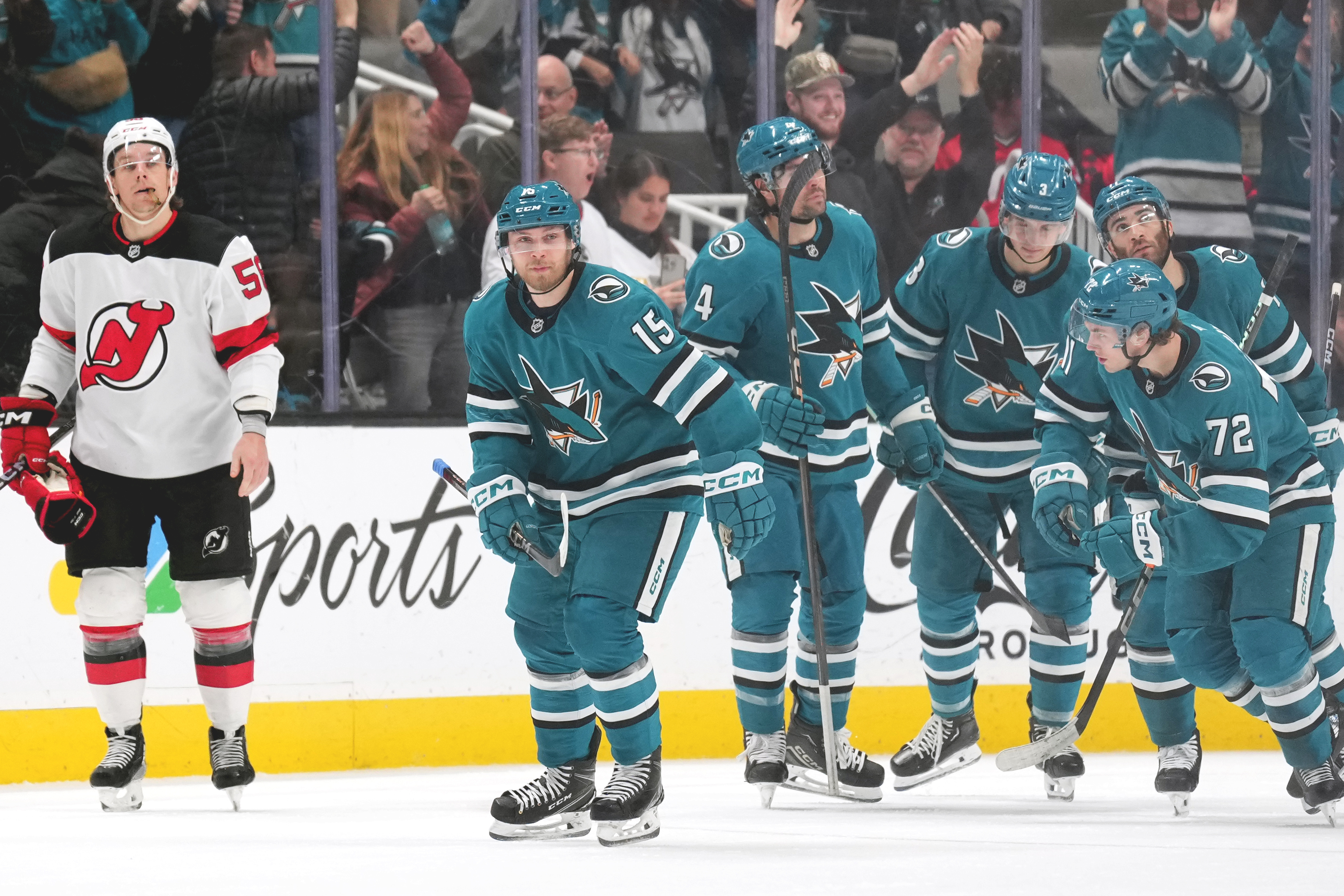 Jan 4, 2025; San Jose, California, USA; San Jose Sharks right wing Nikolai Kovalenko (15) reacts after scoring a goal against the New Jersey Devils during the first period at SAP Center at San Jose. Mandatory Credit: Darren Yamashita-Imagn Images - Devils & Comets Remain Winless To Start 2025 Calendar Year