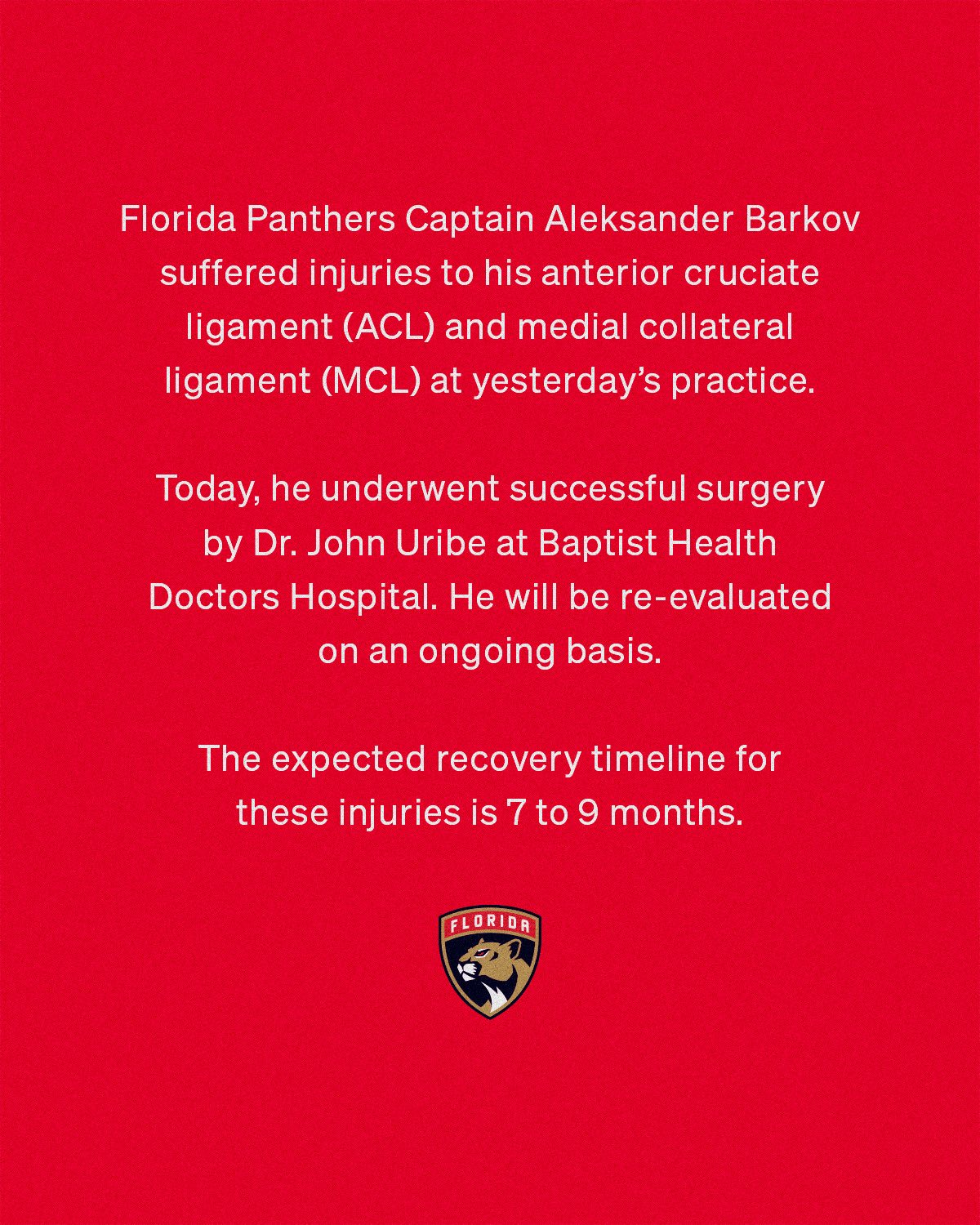 News broke on Friday morning that Florida Panthers captain Aleksander Barkov will be having surgery on his right knee and will miss the entire 2024-25 season: