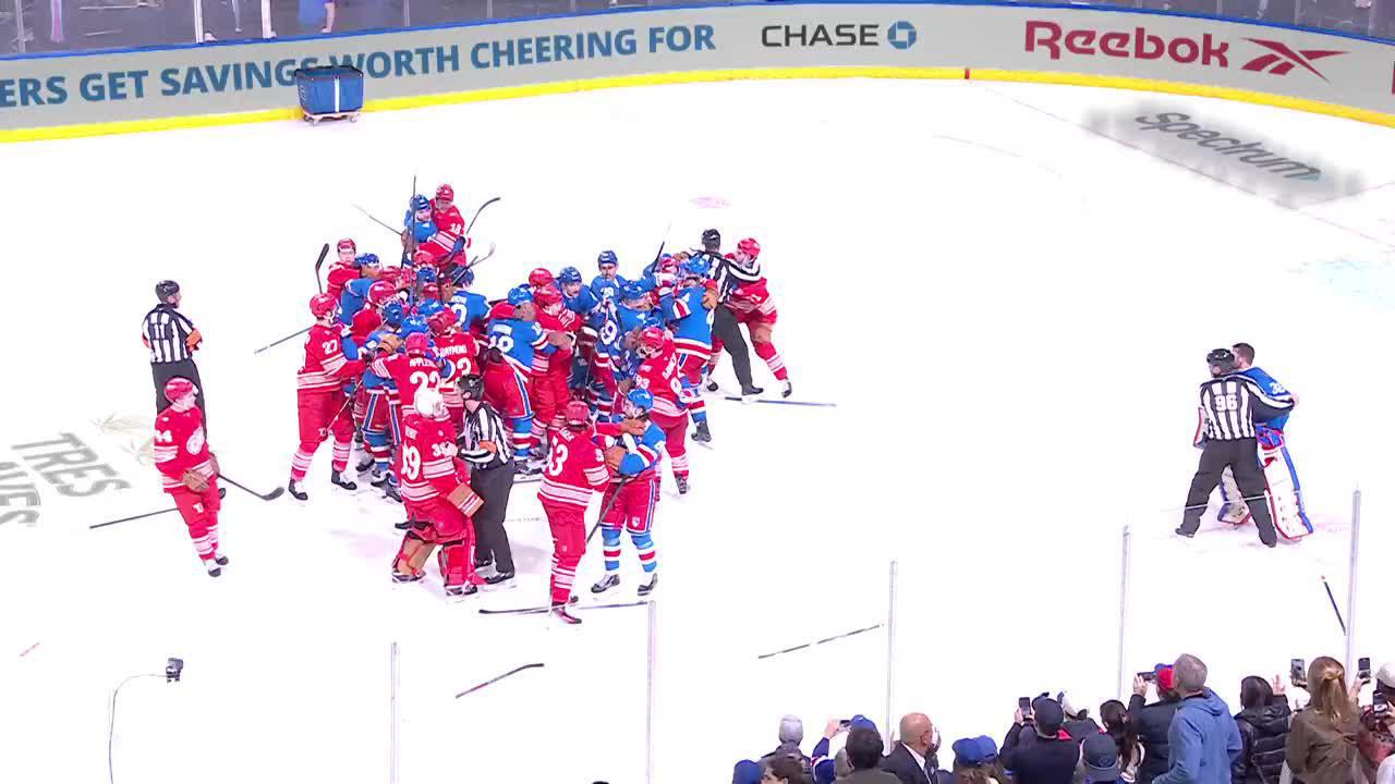 Chaos as Mason Appleton shoots after the buzzer and the benches empty 😮 #LGRW #NYR