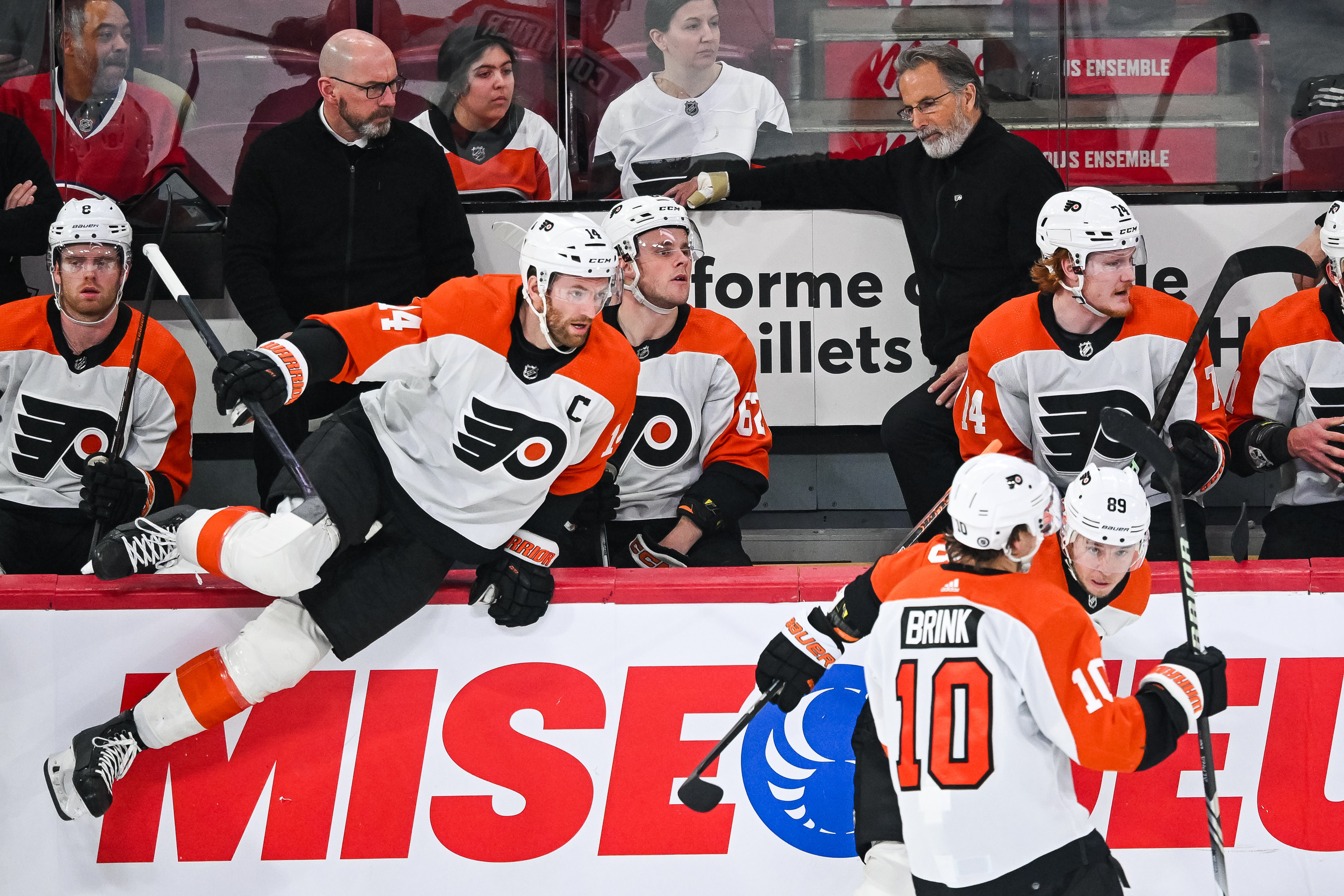 Philadelphia Flyers head coach John Tortorella looks towards center Sean Couturier (14) as he jumps on the ice against the Montreal Canadiens during the first period at Bell Centre.