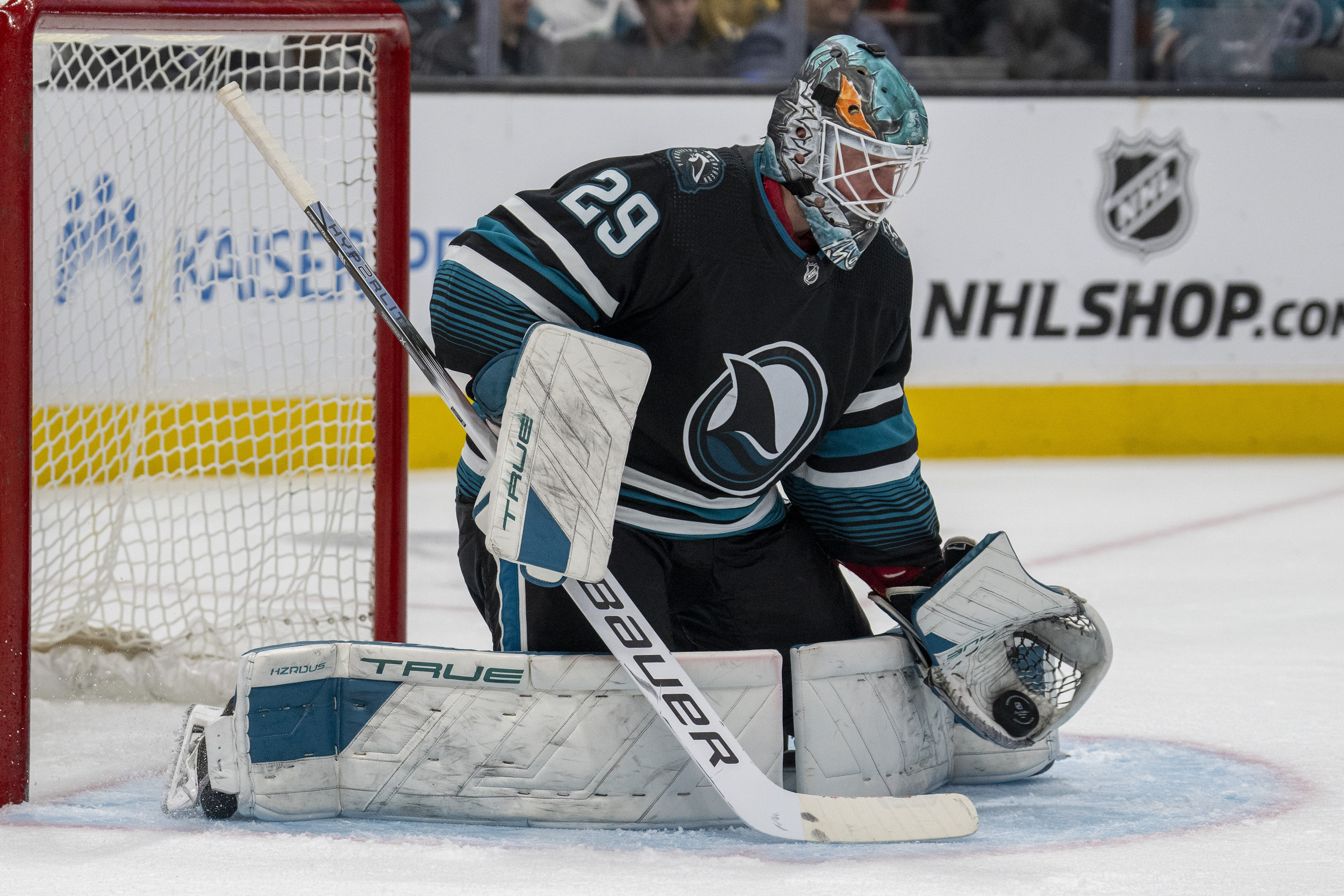 In the first period, San Jose Sharks goalie Mackenzie Blackwood left the game tonight against his former team, the New Jersey Devils.