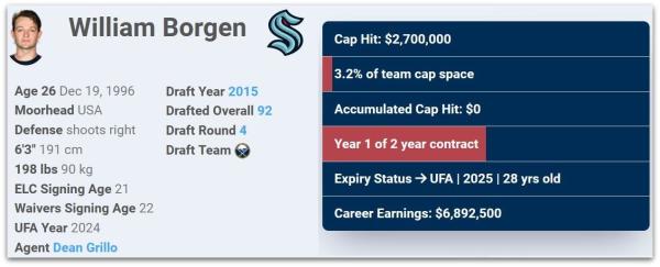 Borgen, a restricted free agent, signed a two year, $5.4 million contract to remain with Seattle. It's a reward for a breakout season, when the 6-foot-3, 204 pound blueliner played all 82 regular season games, and all 14 in the postseason, too.