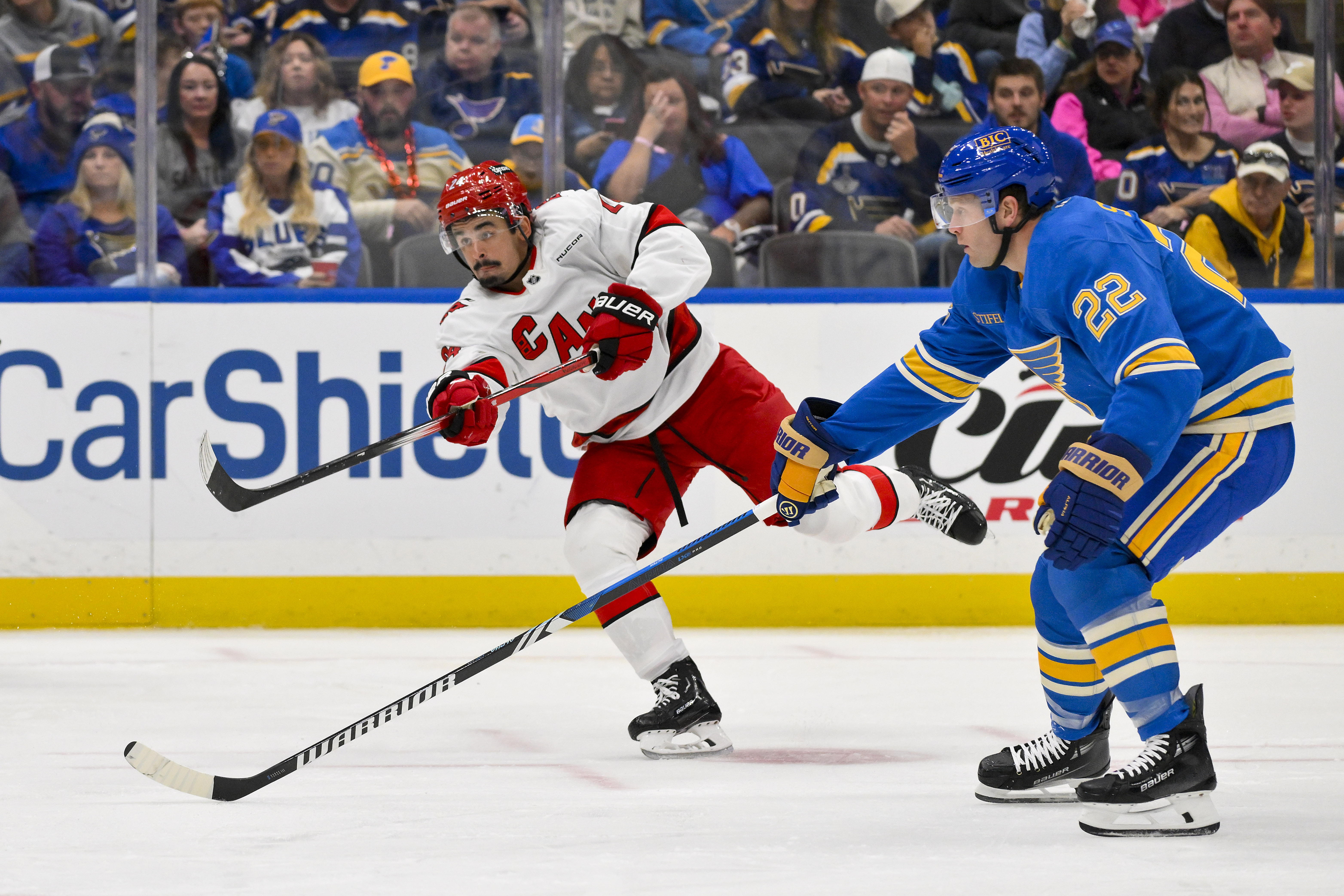 ST. LOUIS -- It was a battle of attrition for the St. Louis Blues in their 4-3 win against the Carolina Hurricanes on Saturday at Enterprise Center.