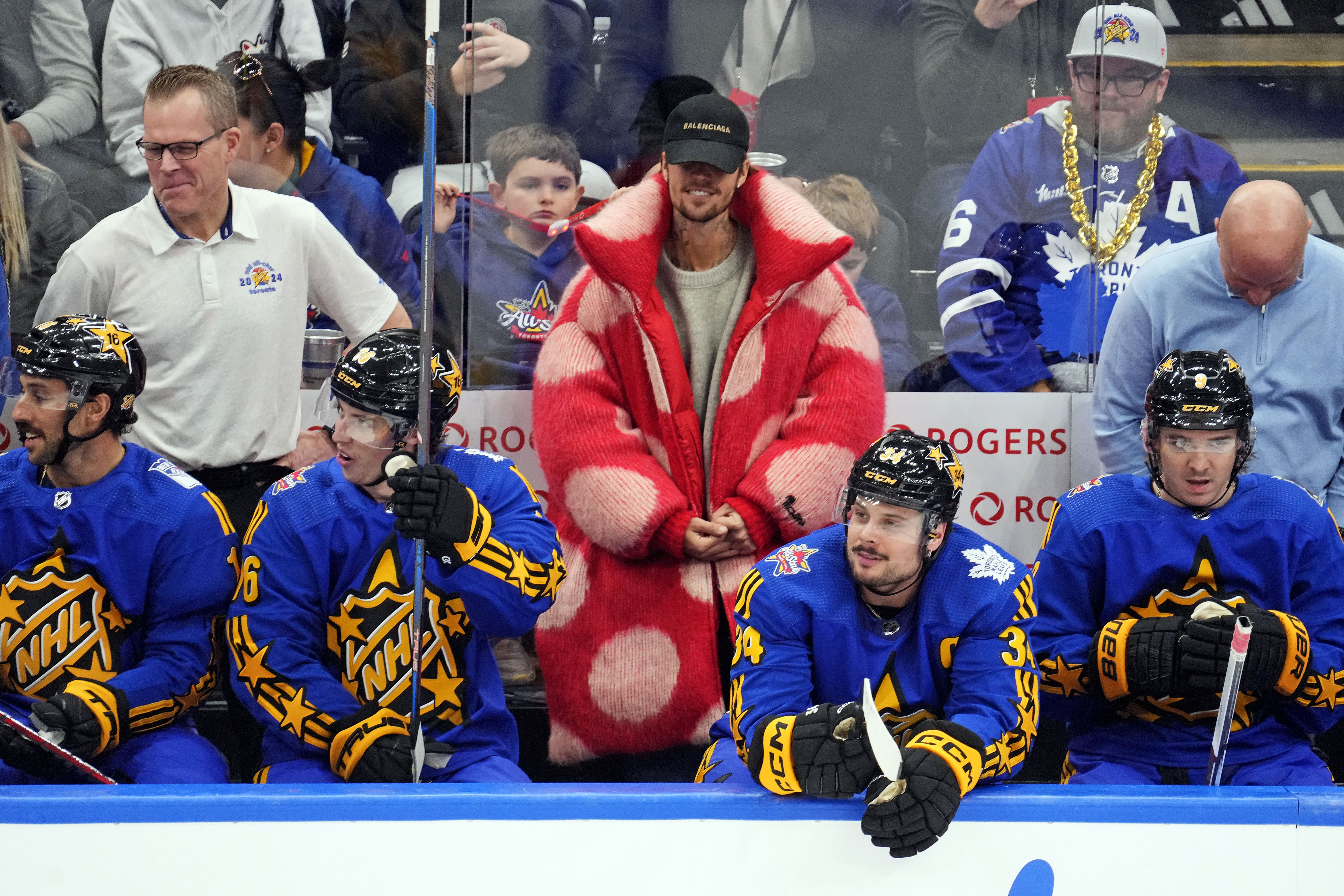 Bieber hasn't been shy to wear flashy jackets to Scotiabank Arena. Back in Dec. 2022, the Canadian music superstar attended a Maple Leafs game wearing a pink jacket with hearts.