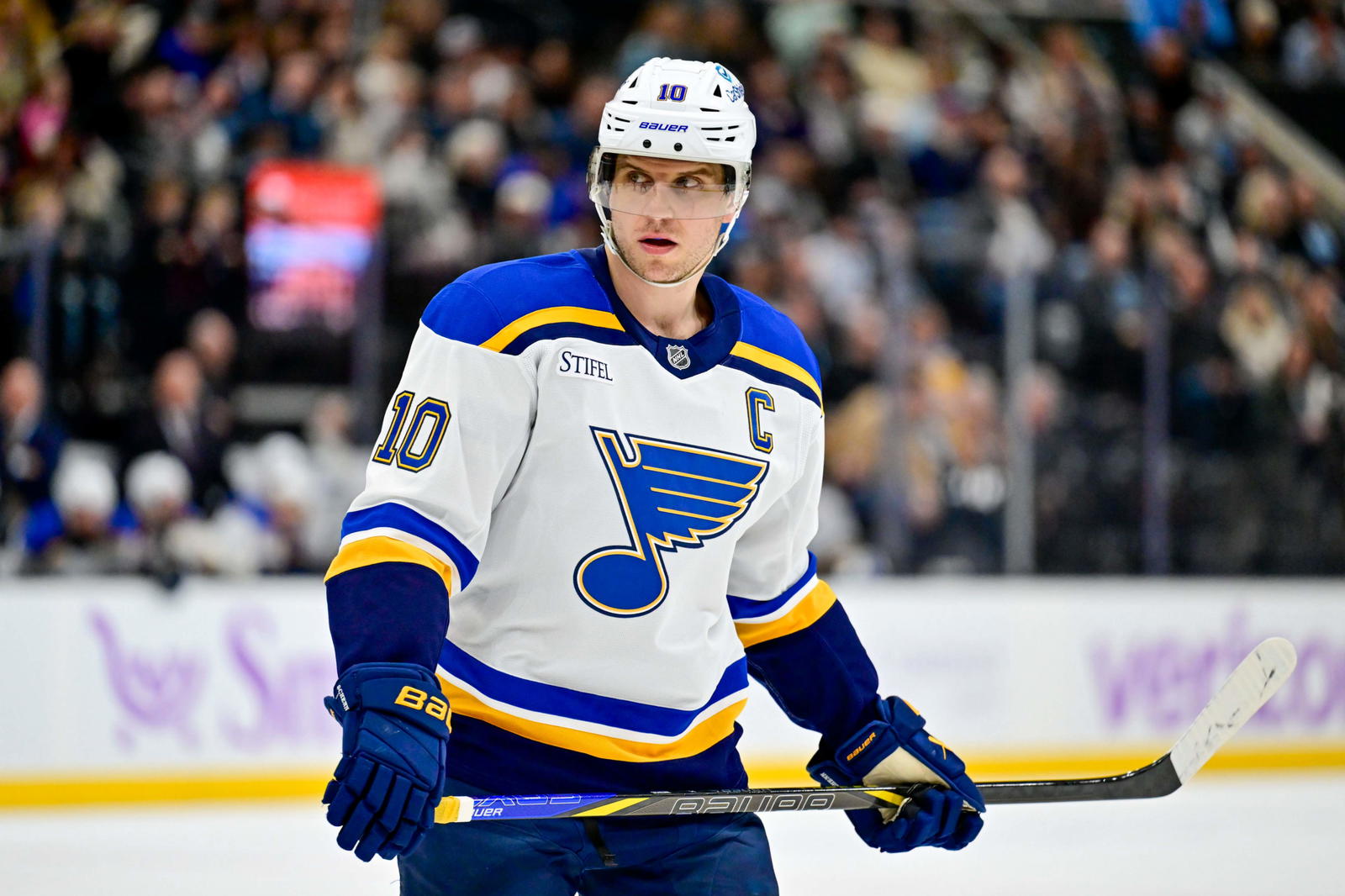 Jan 18, 2025; Salt Lake City, Utah, USA; St. Louis Blues center Brayden Schenn (10) before a face-off against the Utah Hockey Club during first period at the Delta Center. Mandatory Credit: Christopher Creveling-Imagn Images