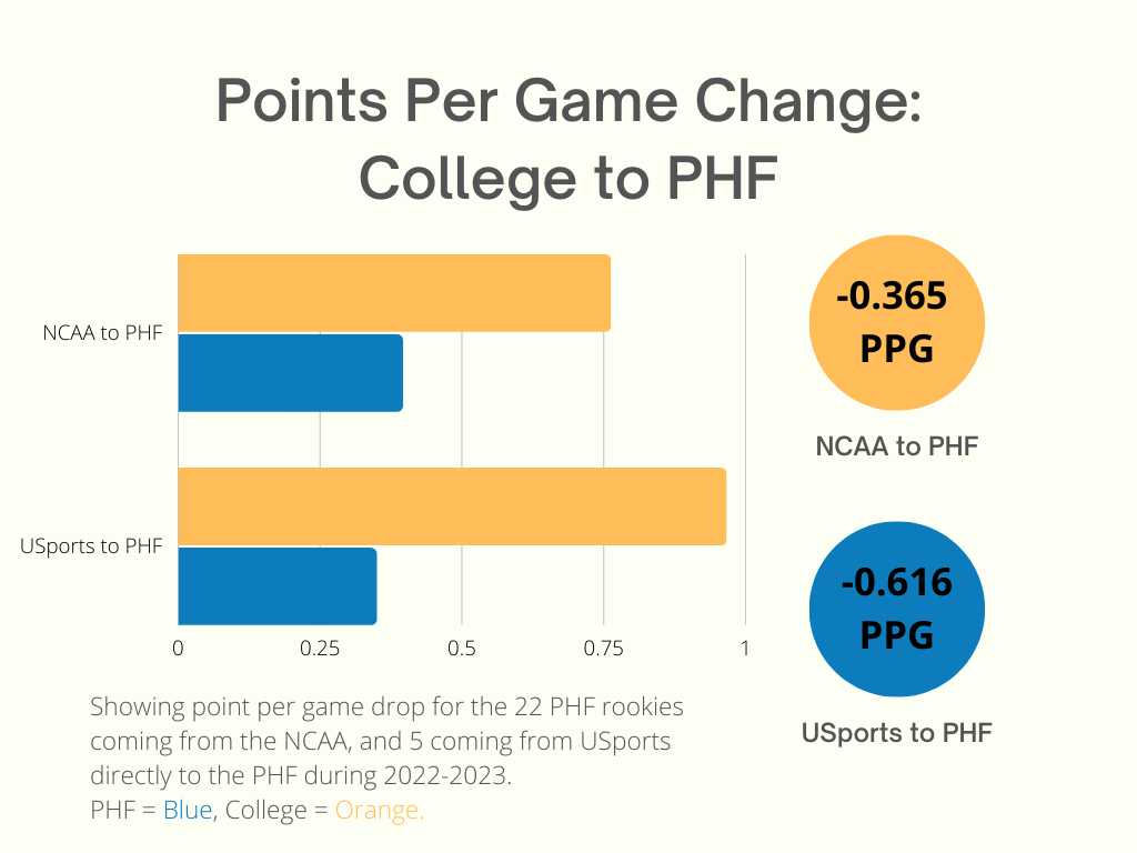 Looking at the 22 NCAA players and five Usports players who moved directly from college hockey to professional women's hockey last season in the PHF, players overwhelmingly experienced a drop in their points per game.