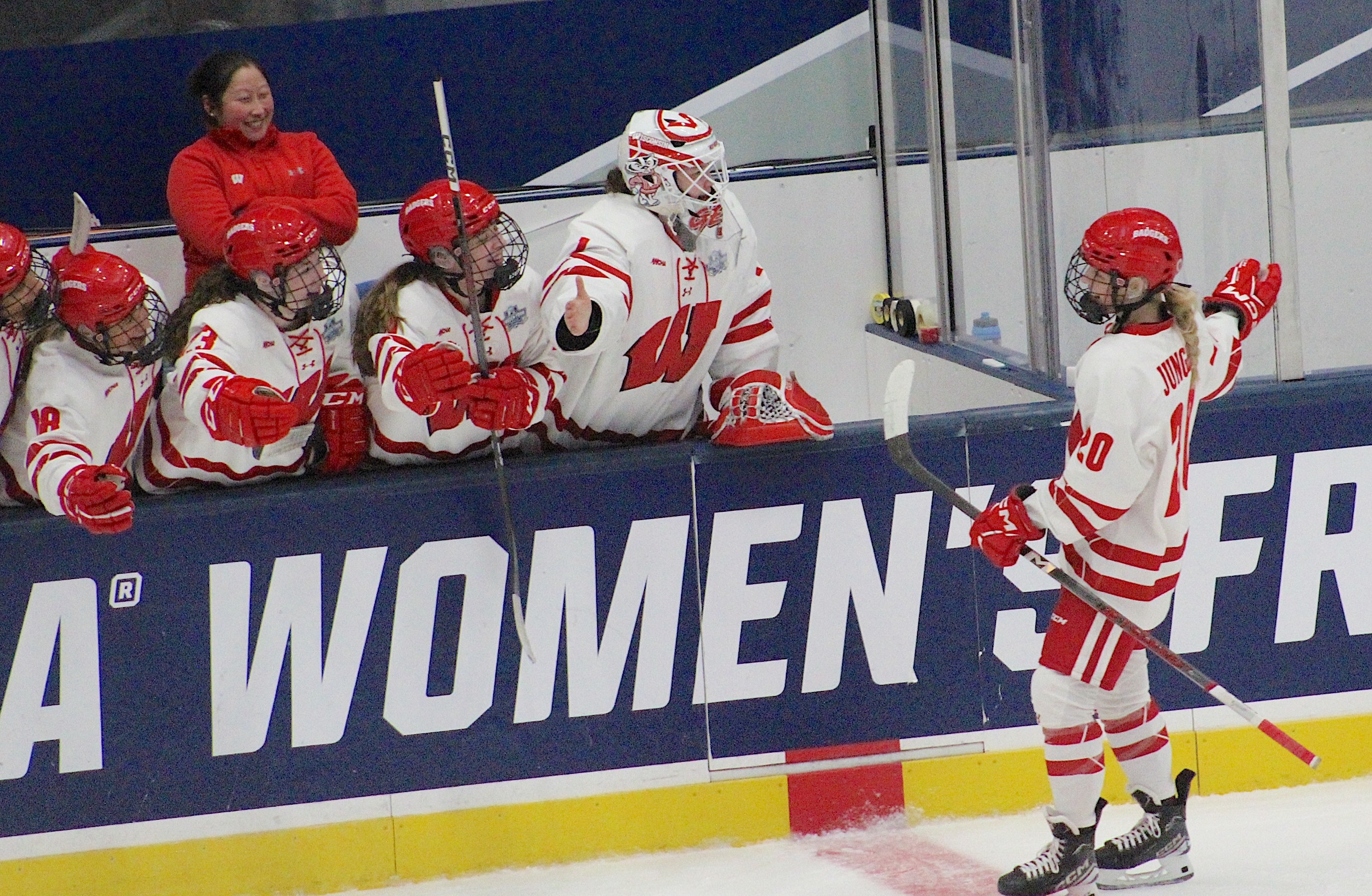 The Badgers protected a 1-0 lead behind the freshman goaltender's steady play, before Jungels chipped in an insurance goal at 11:29 of the third period. Senior Britta Curl sent a cross-ice pass to Jungels, who fired a wrist shot past Raiders goaltender Kayle Osborne from the left circle.