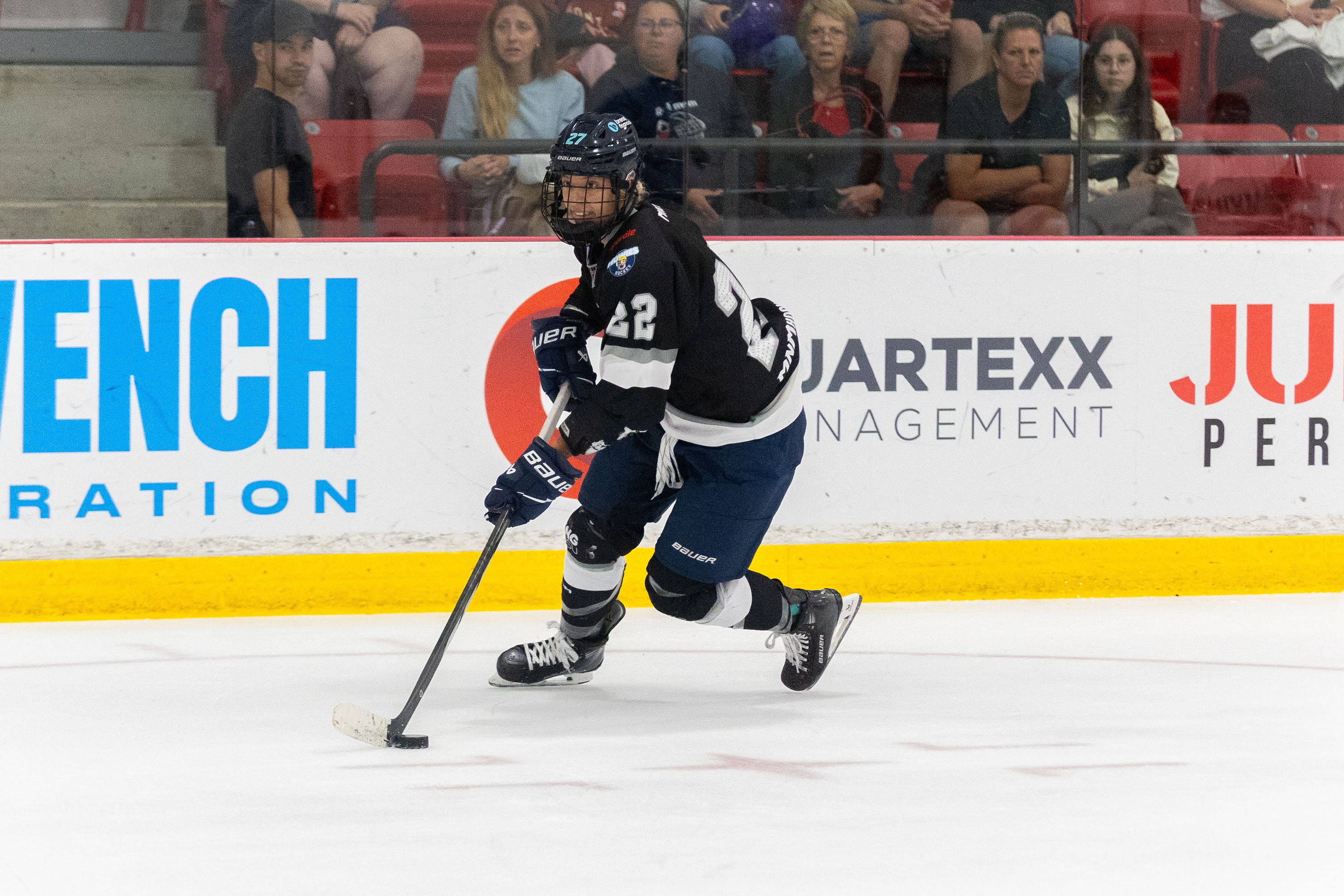 Behind the bench for Poulet Rouge was Laurianne Rougeau, who played with PWHL Toronto last season. She injured her wrist during the last game of the season against Ottawa, still played through the playoffs, but had to get surgery after Toronto got eliminated against Minnesota. She still wears a brace, hence the reason she was behind the bench and not on the ice.