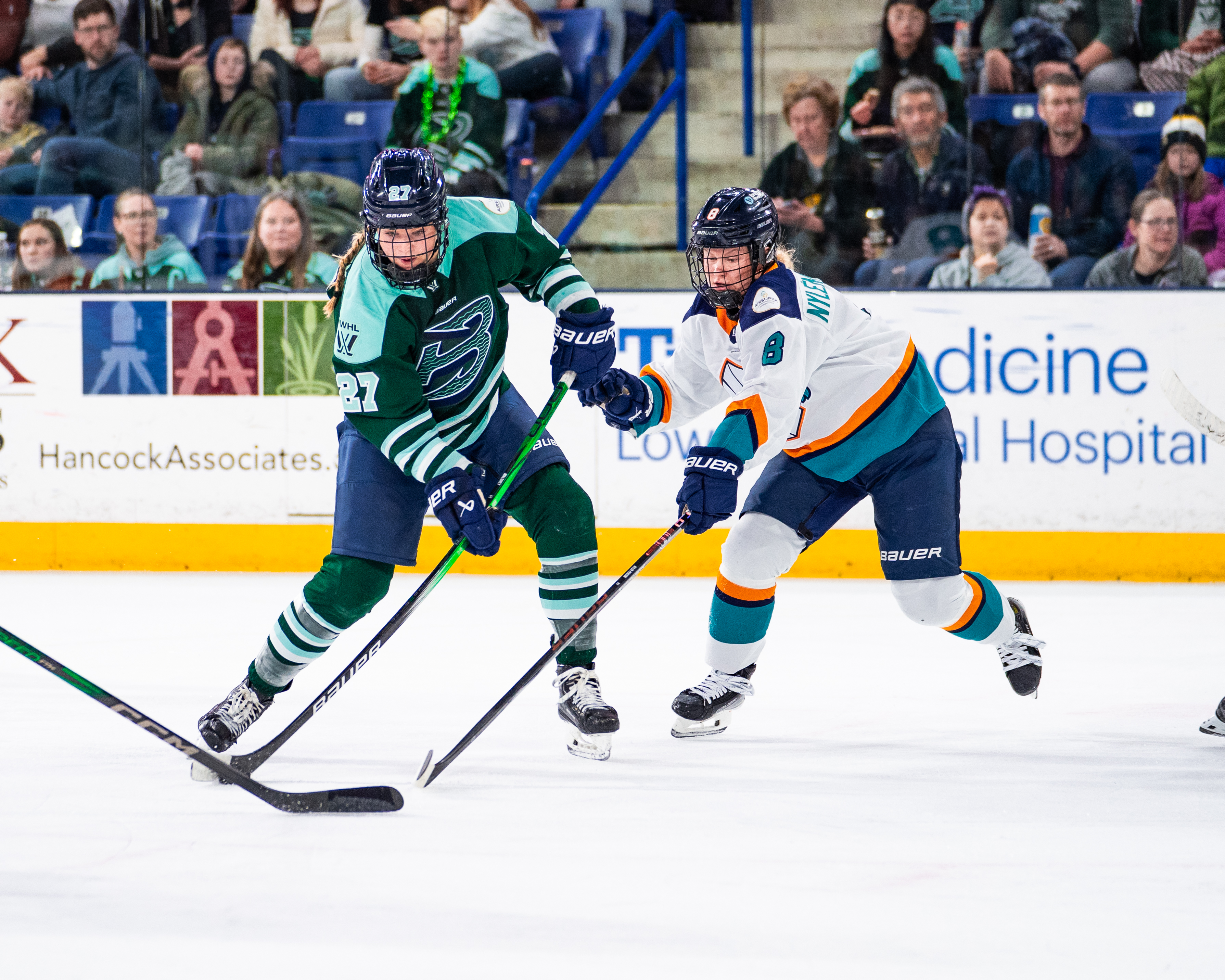 The first goal came at 14:36 and the second goal came at 17:49 after the Sirens had decided to pull their goalie. The second goal was assisted by Taylor Girard, who was returning to Boston less than two weeks after being traded to the Sirens.