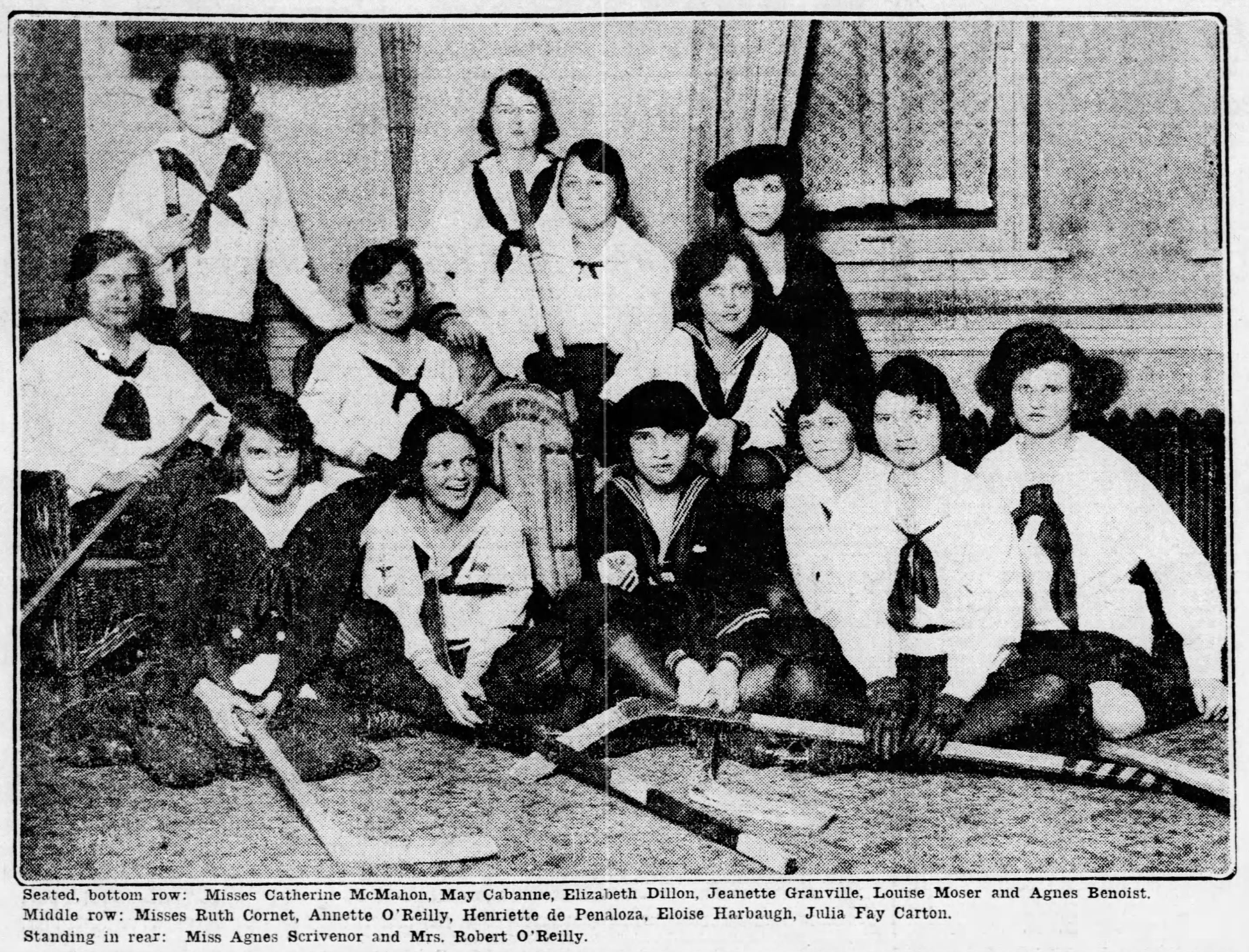 In 1920, when two women's teams stepped on the ice, nicknamed ‘Sticks,’ who wore red and white, and ‘Clubs,’ who wore blue and white,’ the teams were said to be composed of “society girls” who were “debutantes” and “sub-debutantes.” The first women's hockey game in St. Louis history, was played on February 6, 1920, with the St. Louis Post-Dispatch stating it was “quite unusual for debutantes to tackle anything as strenuous as hockey, but they say it is a great sport…”